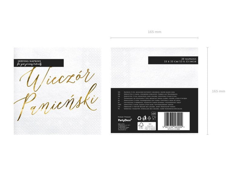 Beli papirnati prtički z zlatim kovinskim napisom „Hen Party“, dimenzije v razgrnjenem stanju približno 33 × 33 cm, dimenzije v zloženem stanju približno 16,5 × 16,5 cm.