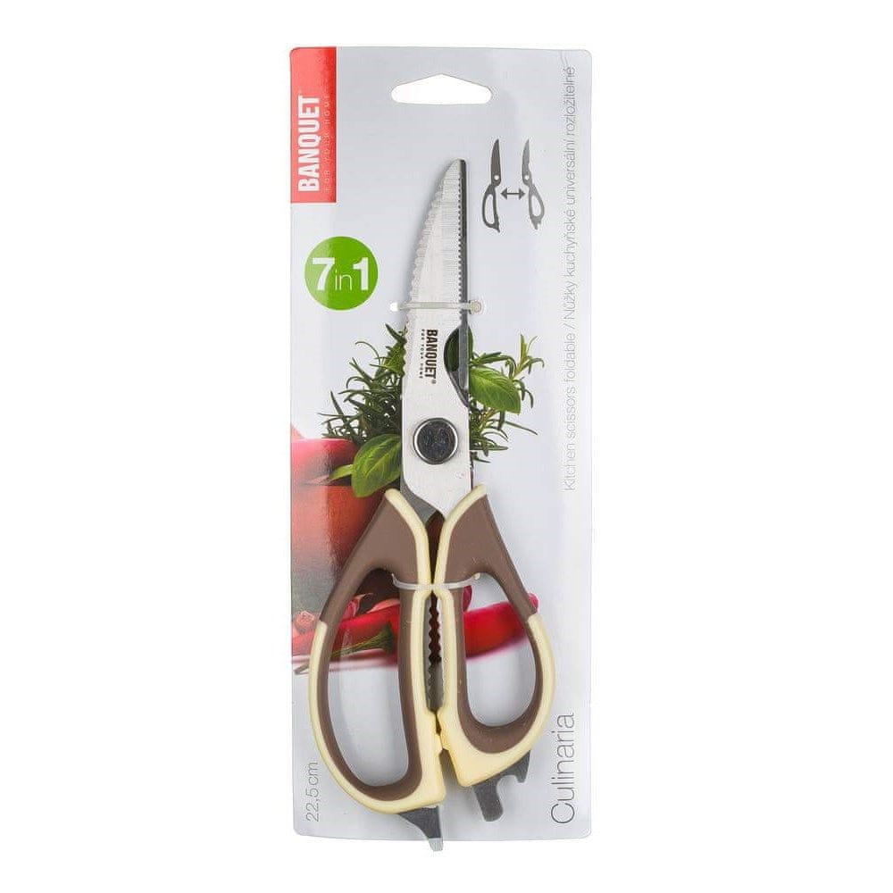 Univerzalne kuhinjske škarje CULINARIA vam poleg rezanja omogočajo tudi lomljenje orehov, strganje rib, odpiranje steklenic, rezanje kartona, strganje sadja in zelenjave ali na primer rezanje perutnine. Ročaji so bež-rjave barve.