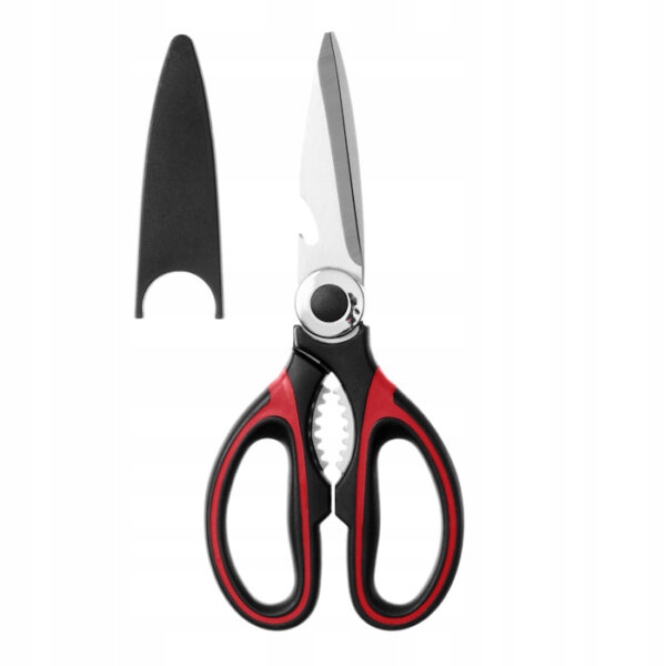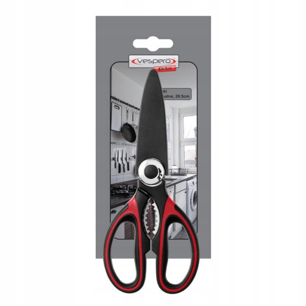 ⭐ Močne in trpežne dvokomponentne škarje za univerzalno uporabo, skupna dolžina 21 cm, dolžina rezila 8 cm, črno-rdeč ročaj.