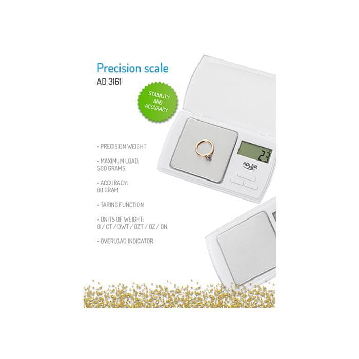 Adler natančna tehtnica AD 3161 – Stabilno, enakomerno delo. Največja obremenitev: 500g. Natančnost: 0.1g. Enote: g / ct / dwt / ozt / oz / gn. Tariranje, indikator preobremenitve. Baterije: 2×CR2032 3V. Celoten opis
