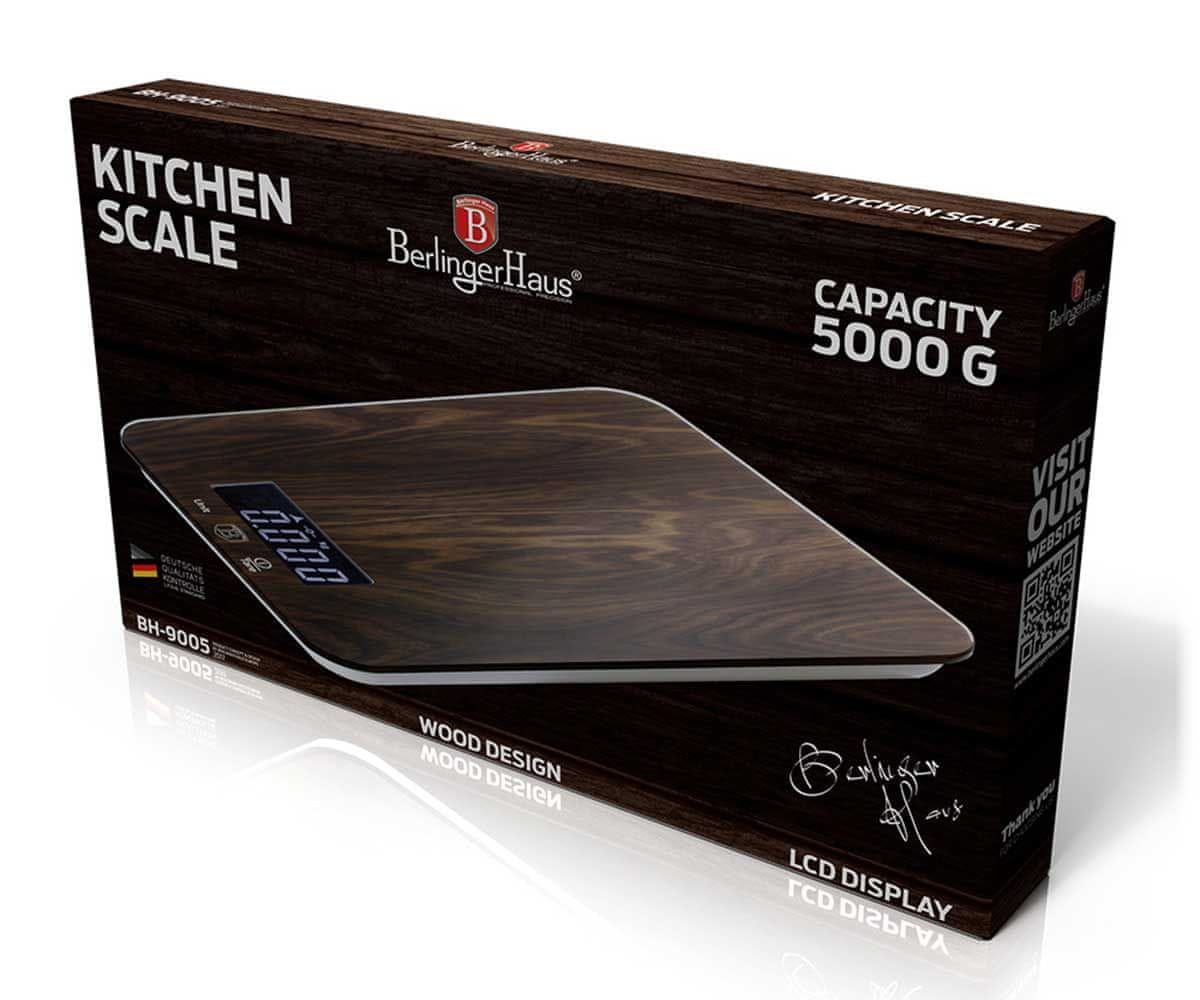 Super ravna kuhinjska tehtnica BERLINGER HAUS . Praktično in estetsko v barvah linije WOOD DESIGN, iz kaljenega stekla. Občutljivost tehtnice je 1g, največja utežena teža pa 5kg. Indikacije so prikazane na velikem LCD-prikazovalniku s tekočimi kristali. Ima zelo priročno funkcijo samodejnega nastavitve ničle in funkcijo TARE. To pomeni, da lahko sestavine damo v skledo in jih malo pretehtamo, ne da bi odstranili prejšnje, ki so tam. Za ta model so značilne estetske lastnosti visokokakovostnih materialov. Tehtnico lahko uporabljate s katero koli posodo ali brez nje.