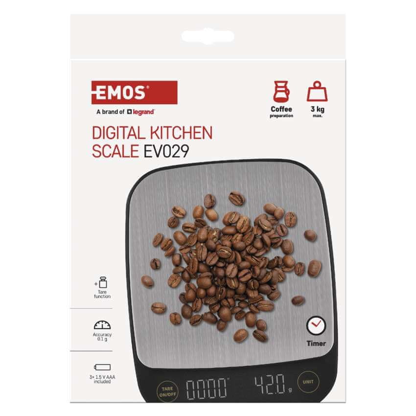 Elegantna EV029 je odlično orodje ne le za ljubitelje kave, temveč tudi za tiste, ki potrebujejo veliko natančnost tehtanja do 0,1 g. Zaradi svoje zasnove iz nevarnega jekla, plastike ABS, kompaktne velikosti in praktične zanke za obešanje bo nepogrešljiv pomočnik ne le v kavarni, temveč tudi v vaši kuhinji. Druge priročne funkcije vključujejo tehtanje TARE, časovnik, alarm za nizko stanje baterije in preobremenitev, vključno s priročno funkcijo samodejnega izklopa. Na tehtnico lahko naložite do 3 kilograme surovin.