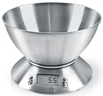 Digitalna kuhinjska tehtnica z odstranljivo posodo iz nerjavečega jekla. Tehtnica ima dva sistema za tehtanje, časovnik, termometer z razponom od 0 do 40 °C ter indikator preobremenitve in izpraznjene baterije. Celoten opis