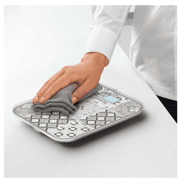 Digitalna kuhinjska tehtnica z velikim osvetljenim LCD-zaslonom, ki je lahko berljiv, ter veliko površino za tehtanje, odporno na praske, zagotovi enostavno in brezskrbno peko. Nudi natančne rezultate in hitro pretvorbo enot za preprosto tehtanje. Zahvaljujoč funkciji tare, ki ponastavi tehtanje na 0 z vsako novo sestavino, vam nikoli ni treba menjati posod!