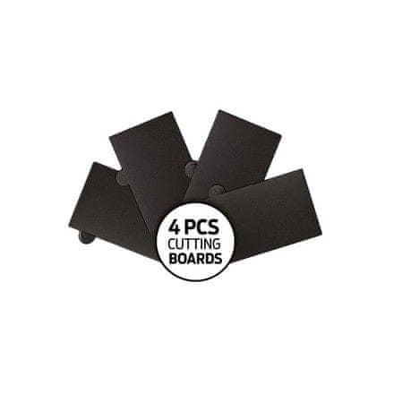 • Material: nerjaveče jeklo s črnim premazom proti prijemanju – Deska za rezanje 4 kosi – Črno stojalo – Nož za kruh 20 cm – Kuharski nož 20 cm – Nož za rezanje 20 cm – Večnamenski nož 12,5 cm – Nož.