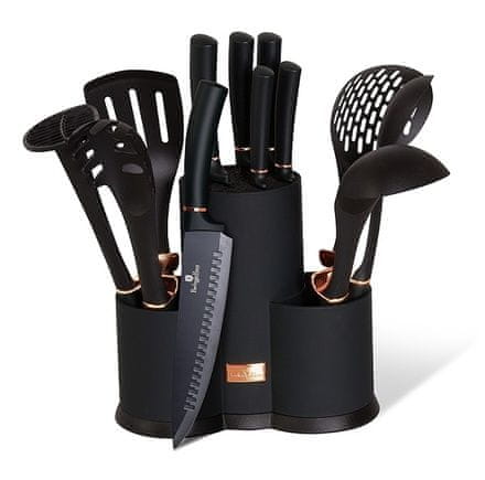 12-delni komplet nožev in kuhinjskih pripomočkov Black Rose Collection v stojalu je odlična alternativa za kuharje različnih stopenj znanja, izdelan je iz visokokakovostnega materiala: nerjavečega jekla z nelepljivo površino, izstopajo z popolno ostrino rezila in dizajnom. Cenili boste tudi ergonomsko oblikovan ročaj, zaradi katerega se bodo noži odlično držali. Celoten komplet je delo proizvajalca BERLINGERHAUS, ki nože proizvaja že kar nekaj časa in so temeljito preizkušeni.