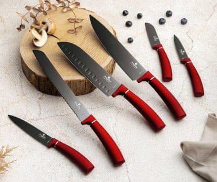 • Material: nerjaveče jeklo s črnim premazom proti prijemanju – Kuharski nož 20 cm – Santoku nož 17,5 cm – Večnamenski nož 12,5 cm – Nož za lupljenje 9 cm – Barva: bordo REGISTRIRAN OBLIK BERLINGER.