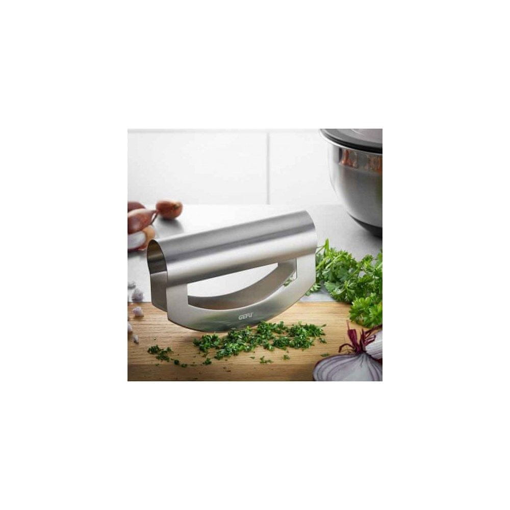 Ni hitrejšega ali enostavnejšega načina za sekljanje čebule, česna, solate ali zelišč. To orodje je idealno za kuharje in vse, ki si to želijo postati. Popolnoma se prilega roki in ima dve ostri rezili, ki hkrati sesekljata tudi najtršo zelenjavo na enakomerne kose. Izdelano je iz visokokakovostnega nerjavečega jekla in je primerno za pomivanje v pomivalnem stroju.