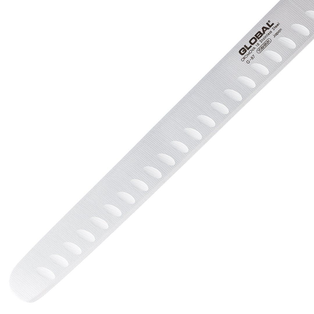 Vrhunski nož Global G-87 je ustvarjen za rezanje pršuta in je enako učinkovit tudi pri rezanju narezkov, lososa in živilih enake konsistence. Dolgo in prilagodljivo rezilo dolžine 27 cm omogoča, rezanje enakomernih in tankih rezin brez napora. Prisotnost zračnih mešičkov na rezalnem robu pa preprečuje, da bi se živilo med rezanjem prilepilo na rezilo. Poudarek serije Global je na ergonomiji in optimalni uporabnosti, zaradi česar je linija priljubljena tako pri profesionalnih kot amaterskih kuharjih. Njegova teža olajša dolgotrajno delo brez utrujenosti. Nož dolžine 40 cm je izdelan iz kakovostnega nerjavečega jekla brez spojev in zato ultra higienski. Global noži predstavljajo izjemno ostrino, najboljšo japonsko izdelavo in optimalno simbiozo funkcionalnosti in elegantnega dizajna. Po uporabi ga ročno pomijte in čim prej posušite.