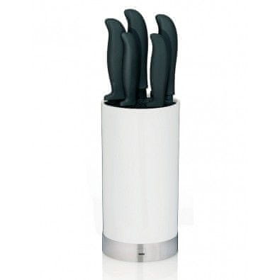Visokokakovostni noži iz črnega jekla v belem plastičnem stojalu iz PP. Priročna notranjost je sestavljena iz tankih plastičnih palic, ki omogočajo prosto postavitev nožev in preprečujejo, da bi se rezila opraskala.