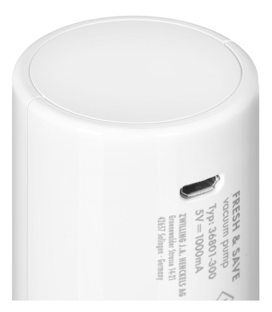 Vakuumska črpalka ZWILLING FRESH & SAVE 36801–300–0 19 cm Bela En gumb za svežino – to je popoln opis vakuumske črpalke ZWILLING Fresh & Save. Brez nerodnih, zajetnih naprav, brez neprijetnega igranja z ročnimi varilkami ali cevmi: elegantna, vitka in priročna vakuumska črpalka ZWILLING naredi vse namesto vas.