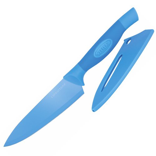 chefov nož iz nerjavečega jekla blagovne znamke Colourtone Stellar z širokim rezilom mehko in hkrati trpežno rezilo . vsevedni za profesionalce in hobi kuharje ki čistijo zelenjavo pa tudi režejo zelišča ali kotlete .