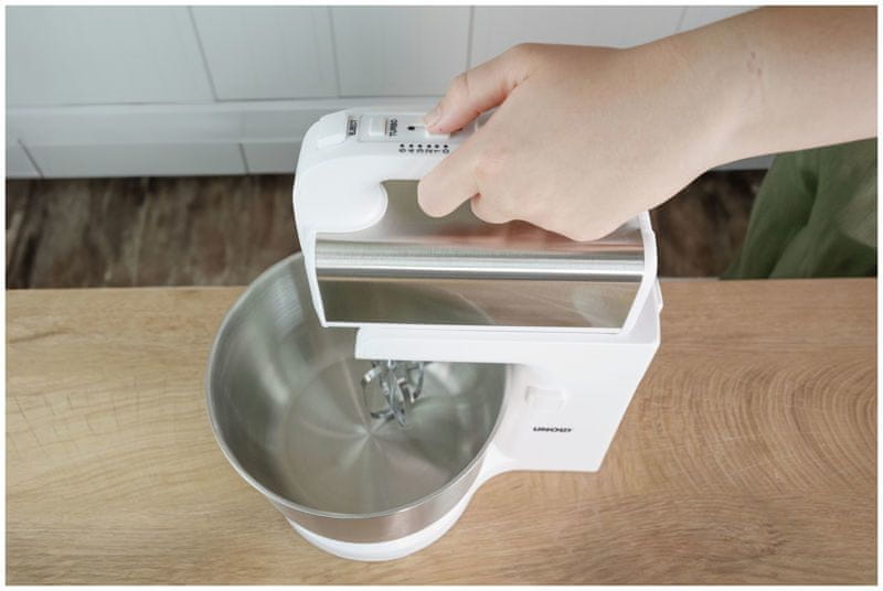 Zahvaljujoč praktičnemu držalu ročnega mešalnika bo vaša kuhinja vedno urejena, samodejno vrteča se posoda iz nerjavečega jekla z veliko 3,5-litrsko prostornino pa sestavine popolnoma zmeša – za enakomerne in puhaste rezultate.