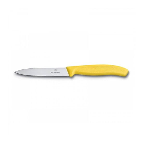 Victorinox nož z 10 cm ravnim rezilom je nepogrešljiv pripomoček za natančno in učinkovito pripravo v kuhinji. Izdelan je iz kakovostnega nerjavečega jekla, ki zagotavlja izjemno ostrino, dolgo obstojnost ter odpornost proti koroziji. Profesionalno brušeno rezilo s koničasto konico omogoča izredno natančnost pri delu, zato je nož idealen za lupljenje, obrezovanje in precizno rezanje sadja, zelenjave ter manjših sestavin. Raven rezalni rob zagotavlja čiste, gladke in nadzorovane reze brez cefranja. Zaradi lahke konstrukcije je rokovanje z nožem enostavno in udobno, kar zmanjšuje utrujenost rok tudi pri daljši uporabi. Ergonomsko oblikovan rumen ročaj iz polipropilena nudi zanesljiv oprijem, stabilnost in dodatno varnost pri delu, kar omogoča popoln nadzor nad vsakim rezom. Nož je primeren za pomivanje v pomivalnem stroju.