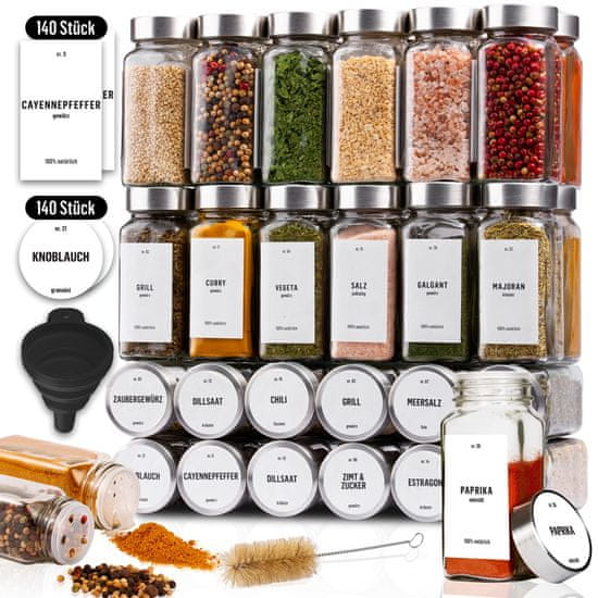 Ne dobite le 36 odličnih kozarčkov za začimbe, ampak celoten komplet, v katerem boste našli vse, kar potrebujete. Vključenih je 100 prednatisnjenih okroglih nalepk z imeni začimb v nemščini, 100 prednatisnjenih pravokotnih nalepk z imeni začimb v nemščini, 40 praznih okroglih nalepk in 40 praznih pravokotnih nalepk na katere lahko pišete s priloženim visokokakovostnim krednim pisalom.