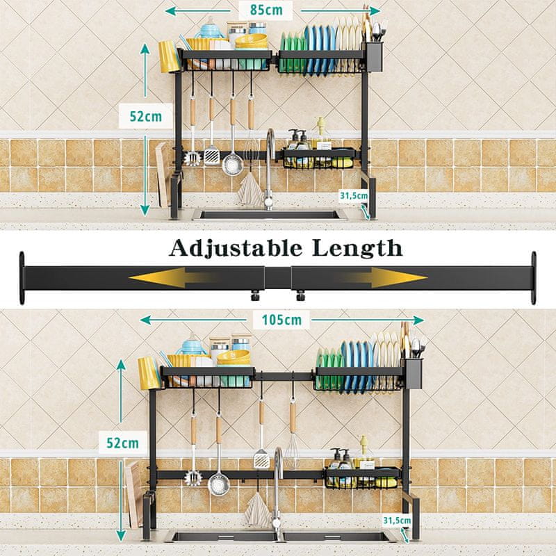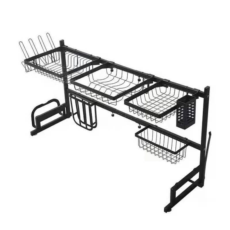Ta neverjetni regal je izdelan iz visokokakovostne in stabilne kovine s črnim zaključkom in je zasnovan tako, da v majhnih kuhinjah maksimalno poveča prostor za shranjevanje, omogoča enostaven dostop do kuhinjskih potrebščin in praktičen prostor za sušenje neposredno nad pomivalnim koritom. Ni le funkcionalen, temveč vašemu prostoru doda tudi pridih sloga, zato je nepogrešljiv za vsak sodoben dom.