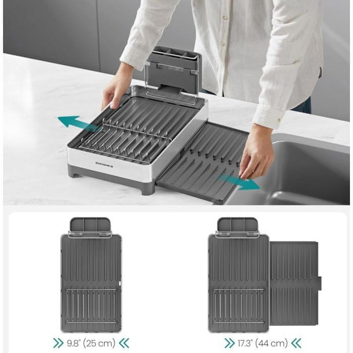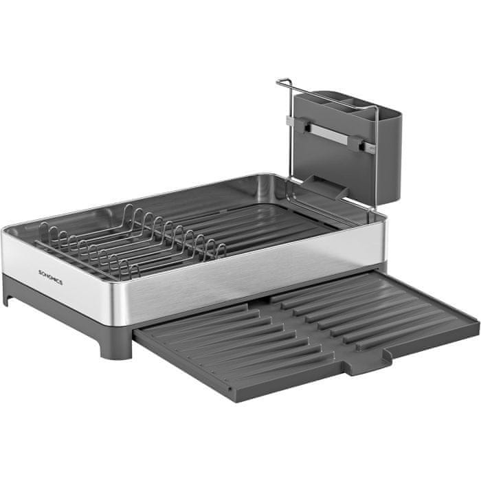 SONGMICS Majhno Stojalo za Sušenje Posode, Razširljivo Stojalo iz Nerjavečega Jekla, s Posodo za Pribor, Odporno proti Rjavenju, za Krožnike, Sklede, Skodelice, Srebrno in Sivo