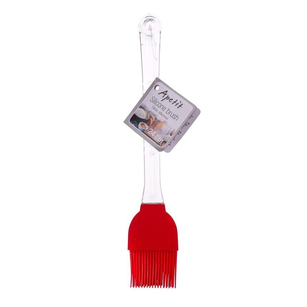 Silikonski ploščati kuhinjski čopič APETIT s prozornim plastičnim ročajem je primeren za krtačenje peciva, mariniranje mesa itd. Dimenzije: 24 × 4,3 cm.