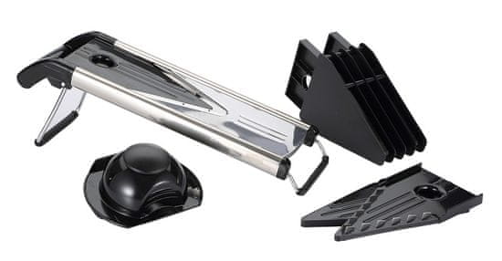 material: nerjaveče jeklo / plastika – mere: 13 × 14 × 41 cm – nedrseče noge – zaščitna prevleka za prste – v paketu so priloženi trije različni nastavki – idealno za krompir, zelje, jabolka, čebulo, kumare, korenje, papriko itd. Celoten opis