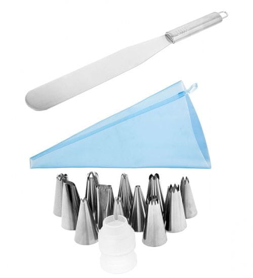 • Komplet 12 konic za okraševanje s silikonskim tulcem in nastavkom – Lopatica – slaščičarski nož za mazanje kreme – Konice so univerzalne in ustrezajo različnim vrstam slaščičarskih tulcev – Idealno za okraševanje tort, pit, različnega peciva in predjedi.