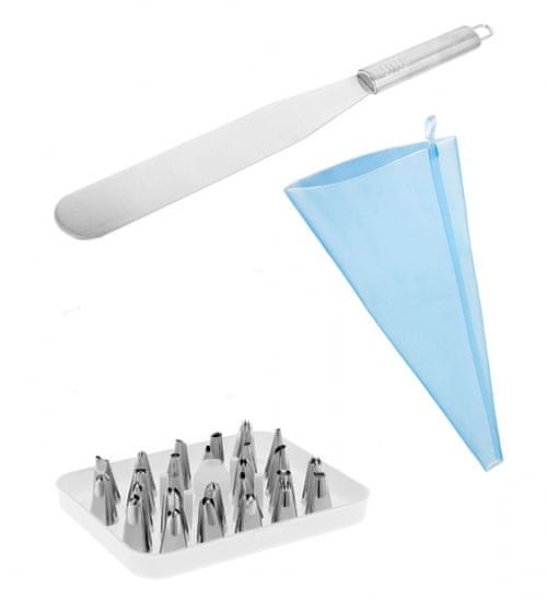 • Komplet 26 konic za okraševanje s silikonskim tulcem in adapterjem – Lopatka – slaščičarski nož za nanašanje kreme – Konice so univerzalne in ustrezajo različnim vrstam slaščičarskih tulcev – Idealne za okraševanje tort, peciva, različnega peciva in predjedi – Adapter trdno drži konico tudi pod visokim pritiskom in pri gosti kremi, poleg tega omogoča zamenjavo konice, ne da bi kremo odstranili iz tulca.