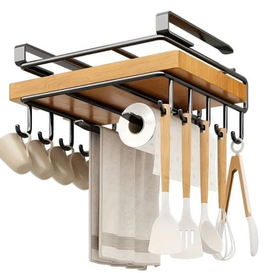 Organizator ima prostor za desko za rezanje za enostavno shranjevanje in hiter dostop pri kuhanju. Poleg tega je opremljen z 10 držali za skodelice ali druge kuhinjske pripomočke, da bo vaš delovni prostor urejen in organiziran. Izdelek je dopolnjen z 2 držaloma za brisače ali krpe, ki vam omogočata, da jih imate vedno pri roki.