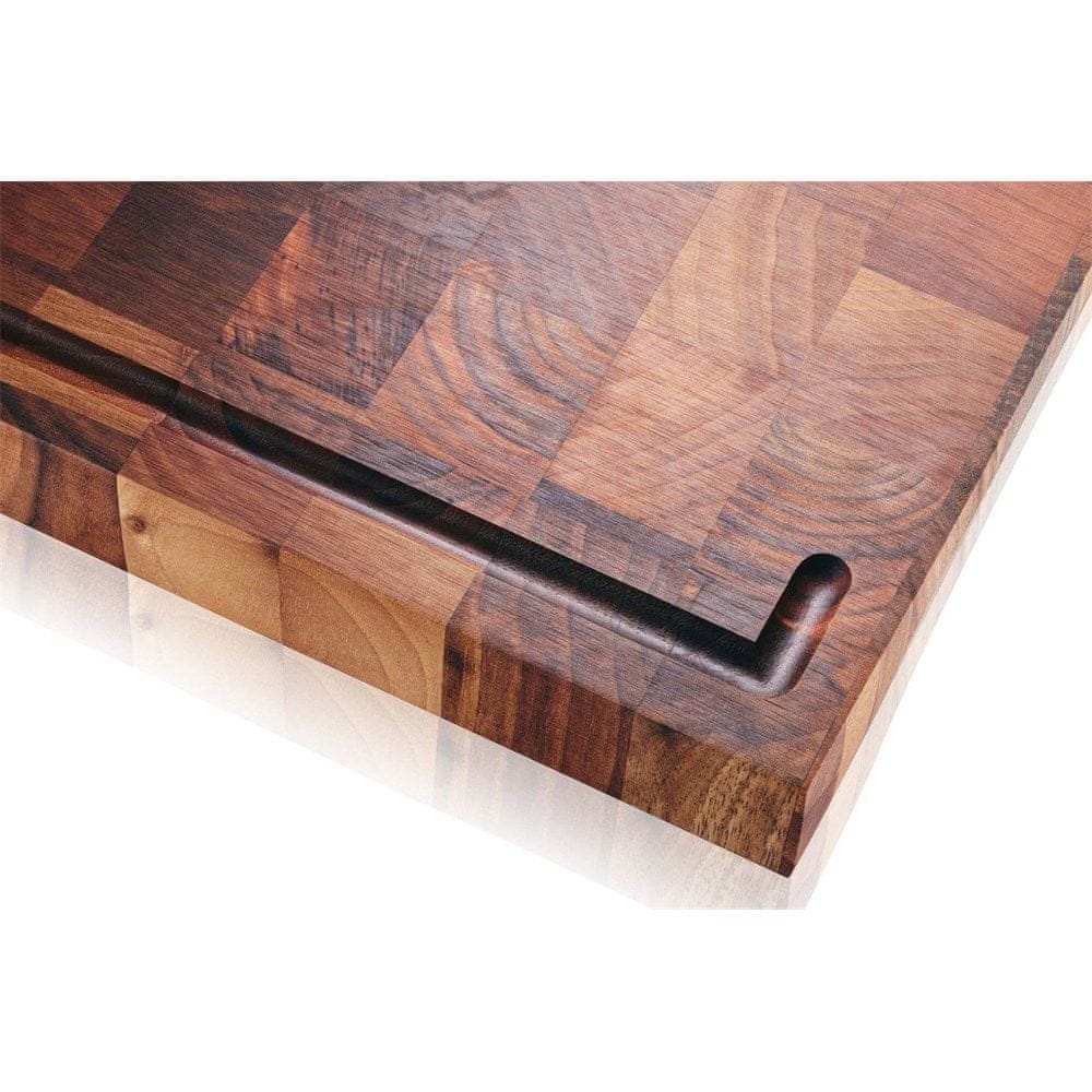 ENNO je trpežen in eleganten blok za rezanje iz visokokakovostnega evropskega oreha. Zaradi edinstvene konstrukcije s čelnimi vlakni je izjemno vzdržljiv in zagotavlja idealno, stabilno površino za sekljanje, rezanje in porcijo različnih živil. Zaradi elegantne oblike in praktičnih lastnosti je ENNO nepogrešljiv dodatek k vsaki profesionalni kuhinji. ENNO je odlična izbira za tiste, ki cenijo profesionalno kuhinjsko orodje z izjemno vzdržljivostjo in estetiko. Izboljšajte svojo kuhinjo s tem razkošnim in funkcionalnim blokom za rezanje! Posebne lastnosti: Konstrukcija s čelnimi vlakni lesa zagotavlja izjemno vzdržljivost in odpornost na intenzivno uporabo. Debelina 4,5 cm za stabilnost in dolgo življenjsko dobo. Stranski ročaji omogočajo enostavno prenašanje in se lahko uporabljajo kot podpora za krožnike. Površina, prijazna do rezil, pomaga ohranjati ostrino. Antibakterijske lastnosti lesa za večjo varnost v kuhinji. Nedrseče nogice preprečujejo drsenje bloka med uporabo. Primerno za pomivanje v pomivalnem stroju – priporočljivo je ročno čiščenje z vlažno krpo. Garancija: 5-letna garancija pod oznako „Q5“. GEFU svojim strankam zagotavlja, da so njegovi izdelki brez napak v materialih, izdelavi in oblikovanju. Dimenzije: Dolžina: 44 cm Širina: 30 cm Višina: 4,5 cm Teža: 3.