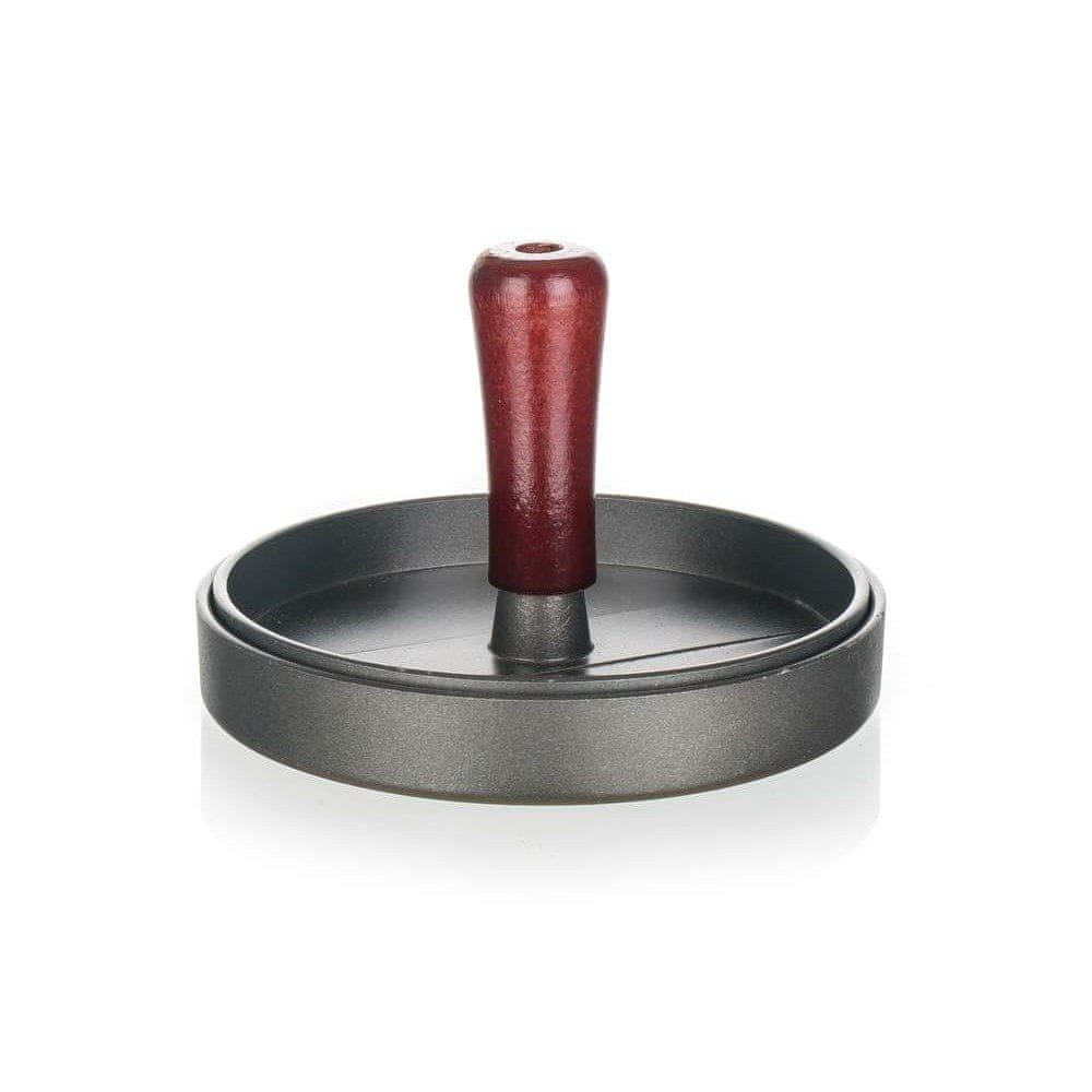 Kalup za burgerje iz mletega mesa, izdelan iz litega aluminija z neprijemljivo površino in lesenim ročajem, premer 12 cm, skupna višina 8 cm. Celoten opis