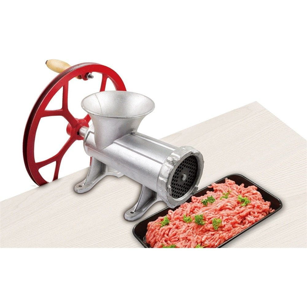 Profesionalni mlinček za meso iz litega železa št. 32 znamke KINGHOFF. Zahteva trajno pritrditev na pult. V celoti izdelan iz litega železa (lito železo).Ta različica mlinčka je prilagojena tako za električni motor kot za ročni pogon.Najpomembnejši del mlinčka je popolnoma usklajen polžasti zobnik, nameščen na ležaju, ki pri počasnem vrtenju (ročno gnan z ročico/kolesom ali z motorjem) premika kose mesa proti mlevskim nožem, ki se vrtijo s polžastim zobnikom, in meso potiskajo skozi disk z majhnimi luknjami z ostrimi robovi.