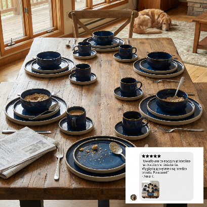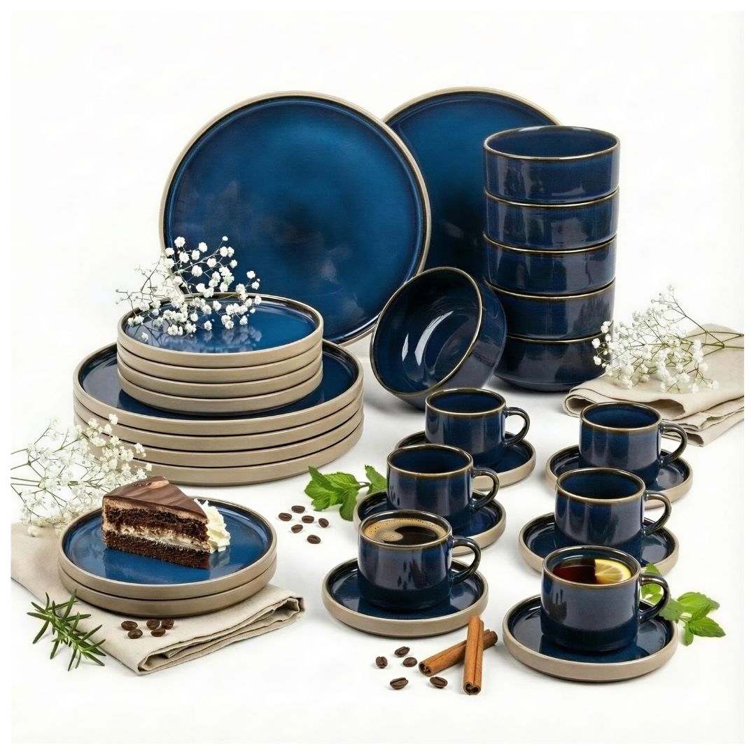 je popolna rešitev za tiste, ki sanjate o lepo predstavljeni hrani in praktičnih dodatkih, ki olajšajo vsakodnevna opravila. Zahvaljujoč elegantni temno mornarsko modri barvi in skrbno izdelani, glazirani površini dobite set, ki bo navdušil vaše goste in vsakemu obroku dodal sijaj ⚡. Poleg tega združljivost s pomivalnim strojem in mikrovalovno pečico zagotavlja maksimalno udobje in prihranek časa. Zahvaljujoč temu kompletu bo vaša miza dobila novo dimenzijo estetike in funkcionalnosti, ob vsakem skupnem obroku pa boste občutili resnično veselje ❤️. ✅ Popoln 30-delni komplet