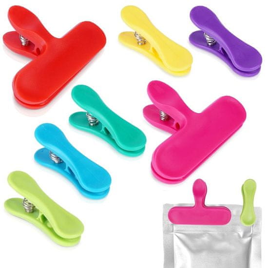 Komplet 7 sponk za zapiranje vrečk. Sponke so izdelane iz trpežnega materiala, ki zagotavlja dolgotrajno uporabo. Izjemno uporaben v vsaki kuhinji. Z njihovo pomočjo lahko tesno zapremo vrečke s prehranskimi izdelki.