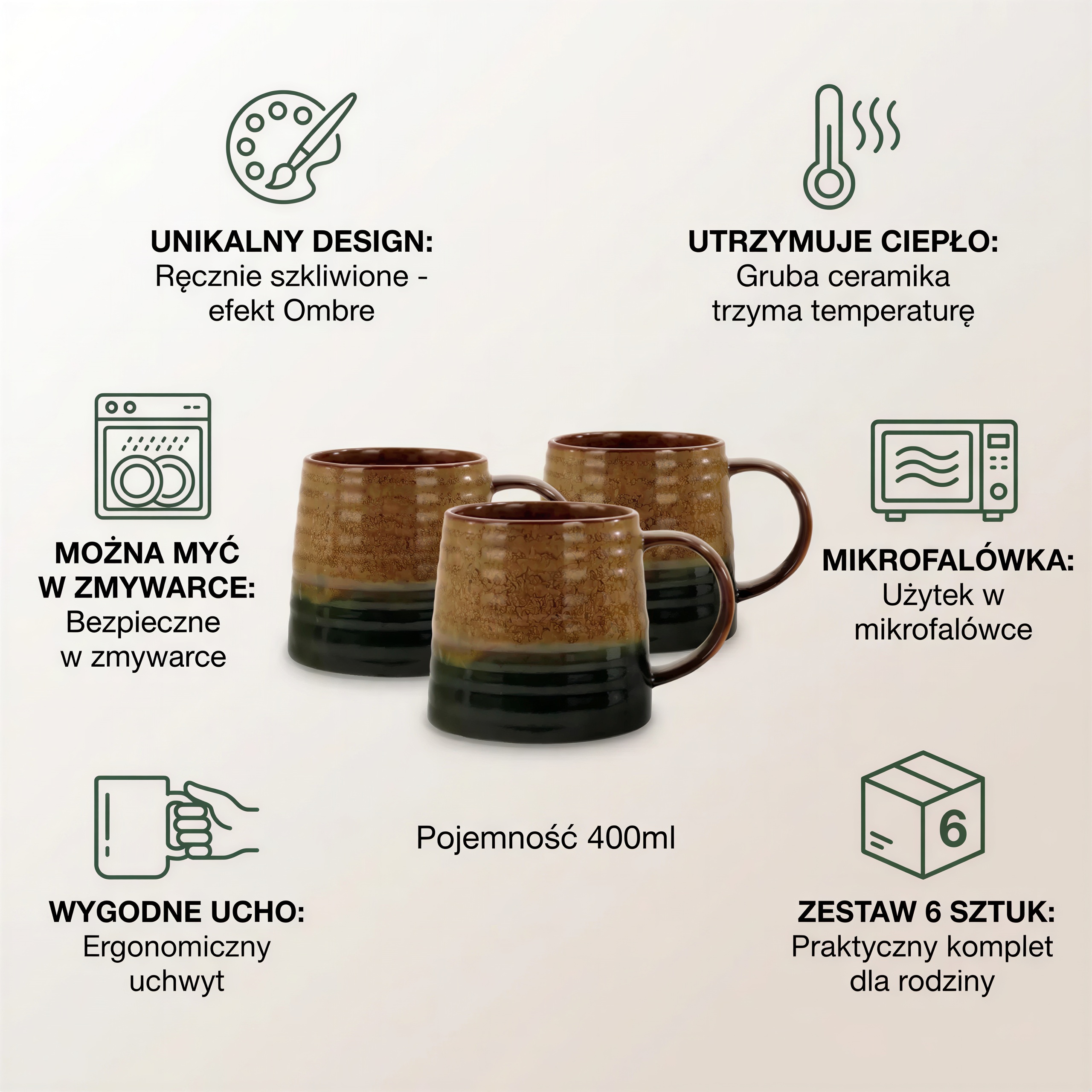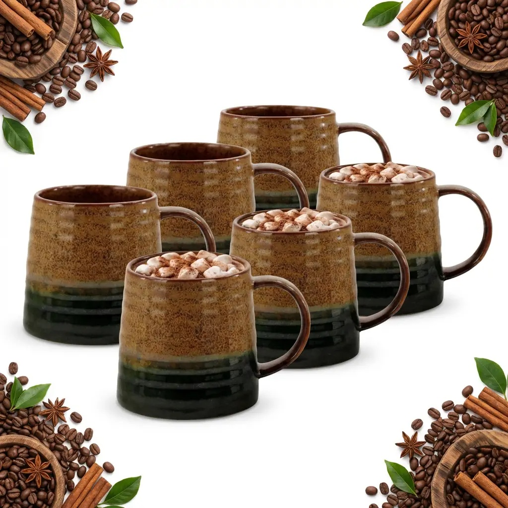 Če iščete nekaj, kar bo vašemu domu dodalo toplino in stil, bo komplet 6 skodelic OMBRES v čudoviti, rjavo-zeleni barvi pravi zadetek v polno. Vsaka skodelica ima prostornino 400 ml in je izdelana iz trpežne, glazirane keramike , idealne za čaj, kavo, kakav, mleko, juho ali kuhano vino . Poleg tega jih lahko varno operete v pomivalnem stroju in jih uporabite v mikrovalovni pečici . Ključne prednosti: ✅ Celoten komplet 6 skodelic