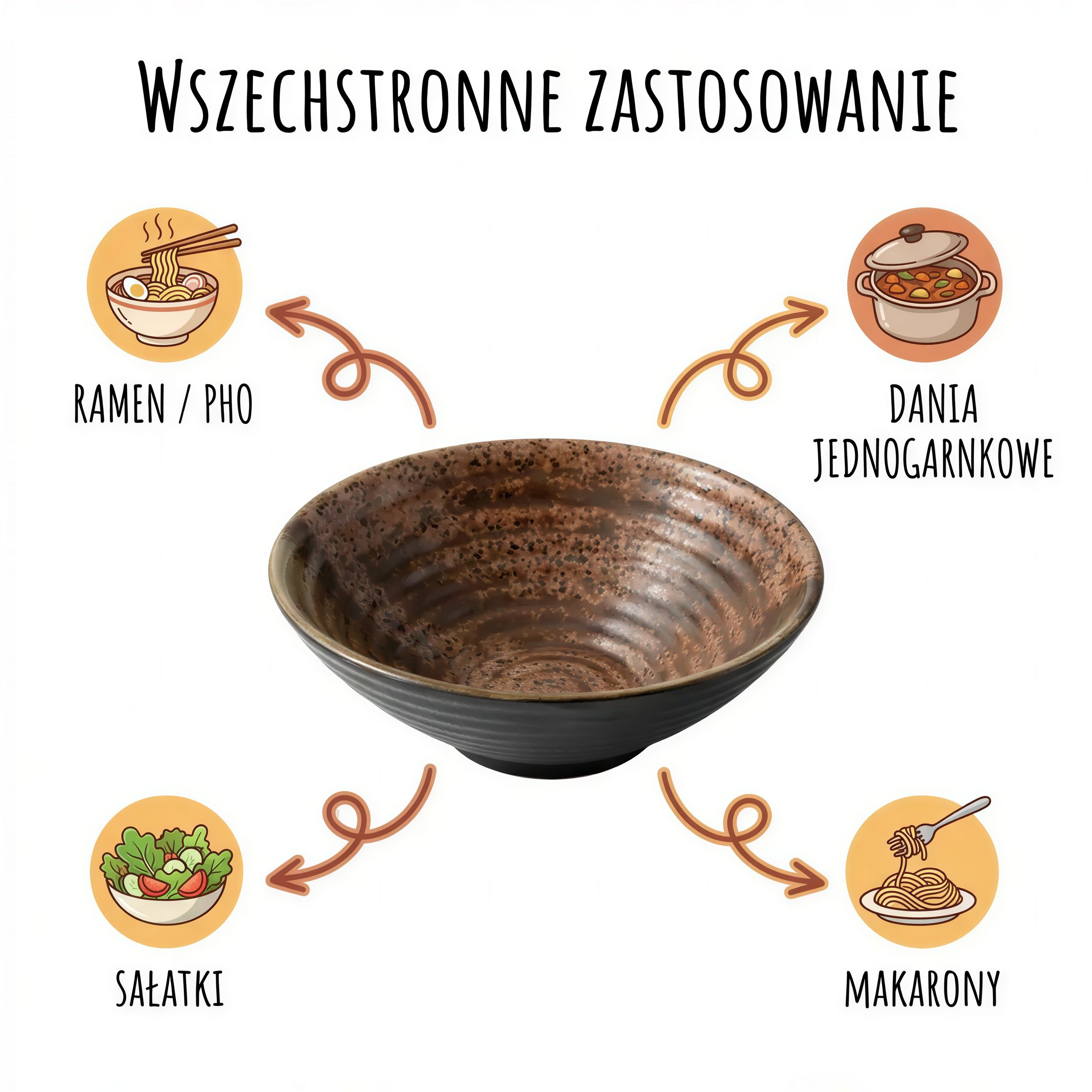 Ste naveličani skled, ki hitro postanejo dolgočasne, so običajne in ne odražajo vzdušja vaše kuhinje? Uživanje ramena ali juhe vsak dan je lahko dolgočasno, če jih postrežete v čemerkoli ☕. Keramična skleda za ramen ONDES je več kot le navaden krožnik – je prava okrasitev mize, ki zahvaljujoč ročni glazuri in edinstveni, naravni teksturi v črni barvi z rjavimi poudarki v vašo kuhinjo vnese vzdušje mirne Azije ✨. S prostornino 1 l in premerom 20,7 cm je idealna za ramen, juhe, solate ali predjedi, saj je primerna za pomivanje v pomivalnem stroju in mikrovalovno pečico, pa olajša vsakodnevno uporabo ⚡. Zahvaljujoč tej skledi bo vsak obrok postal užitek in počutili se boste kot v svoji najljubši japonski restavraciji, le da ste doma ❤️. ✅ Edinstvena oblika – ročno glaziranje in edinstvena tekstura ustvarjata edinstveno vzdušje. ✅