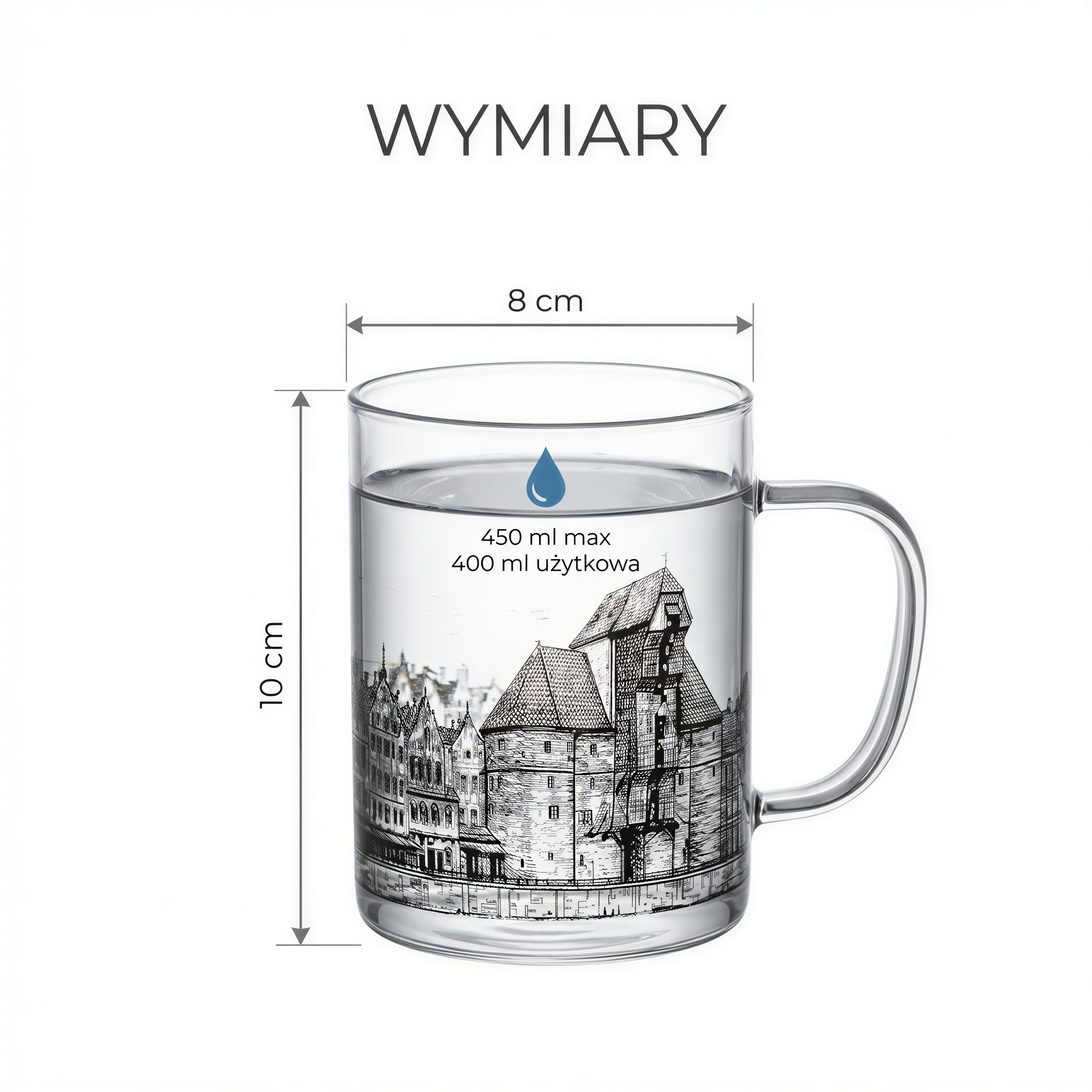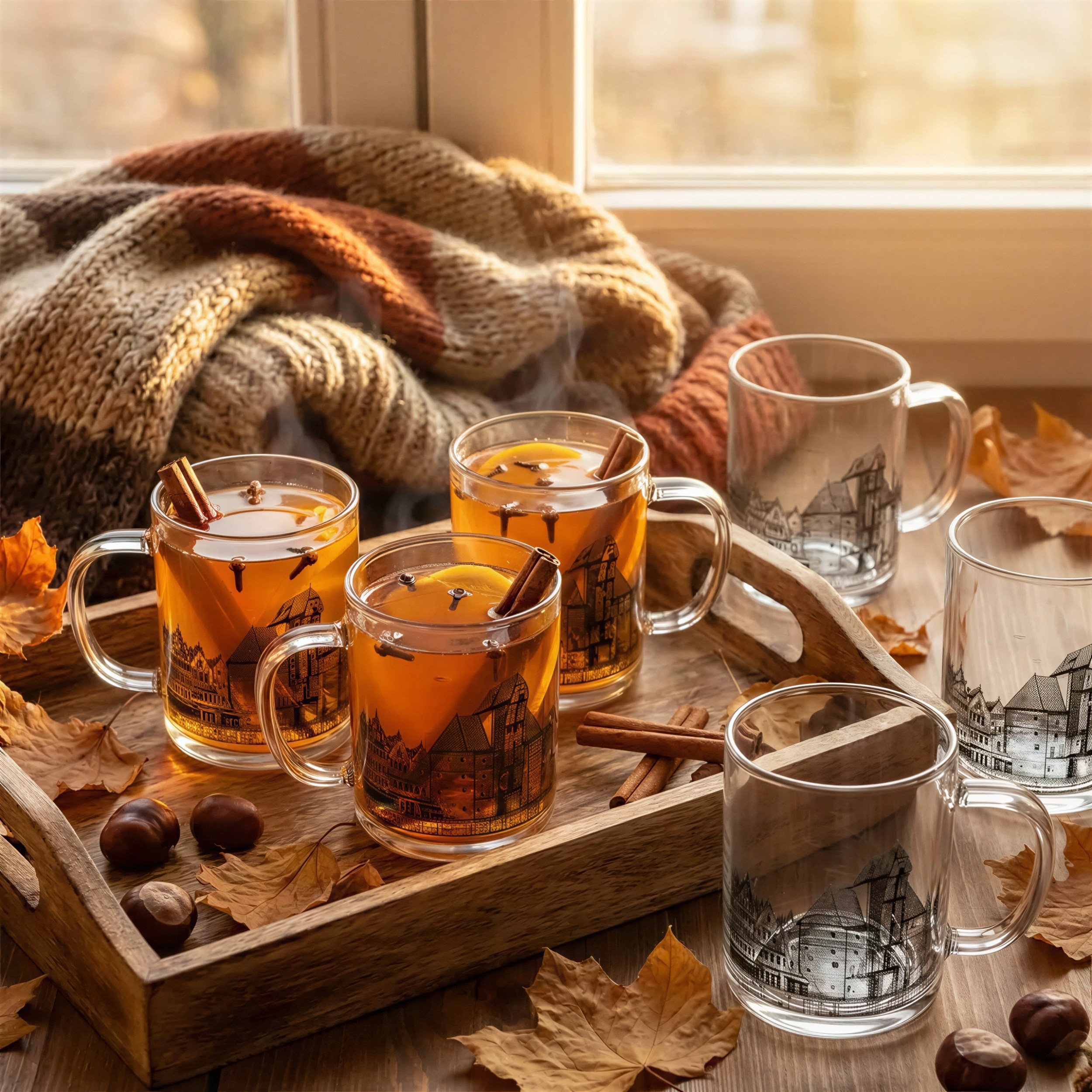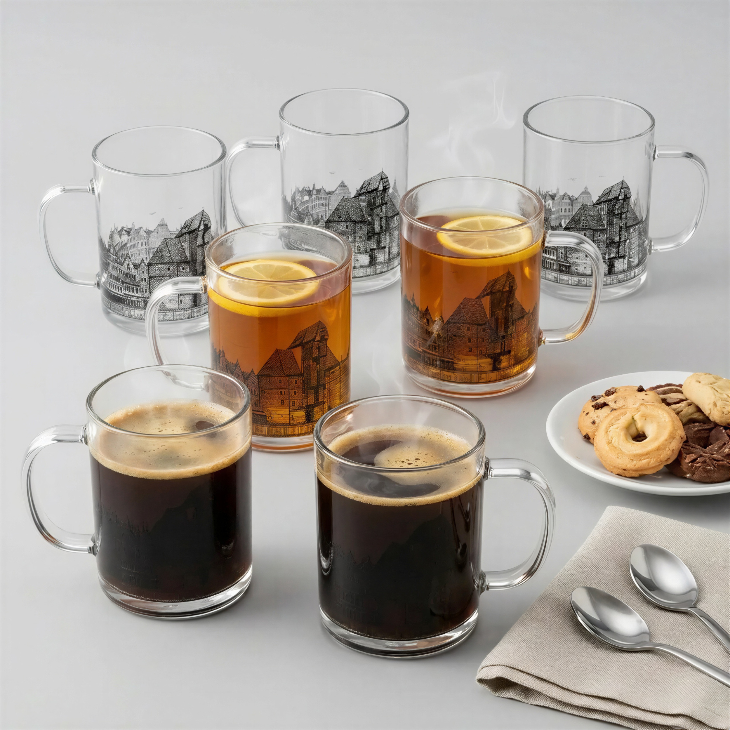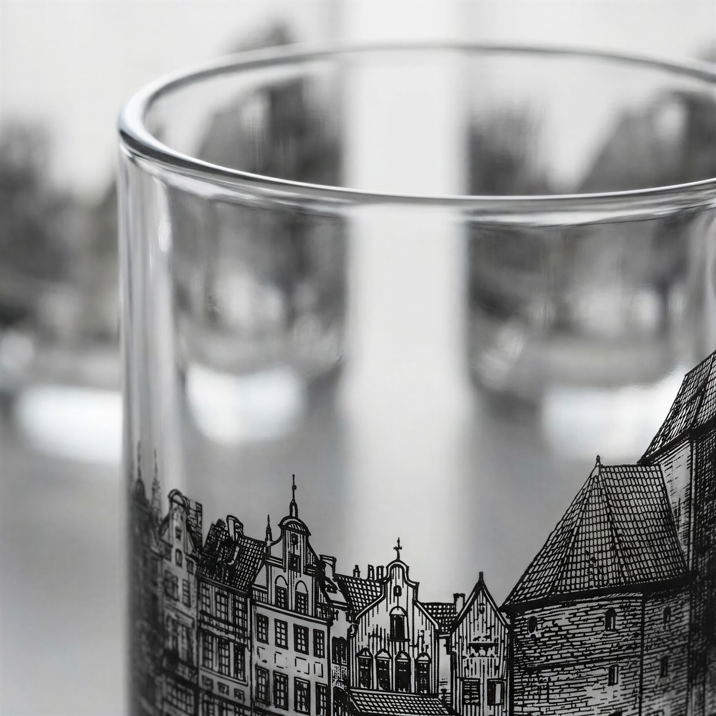 Na dotik občutite gladko, hladno steklo , ki se v roki zdi trdno, a hkrati lahko. Ob pogledu na črni potisk vidite vsako podrobnost gdanske arhitekture, ki se harmonično združuje z barvo vaše najljubše pijače. To je senzorična izkušnja, ki deluje kot mini potovanje nazaj v čas, poudarjeno s prosojnostjo in preprostostjo oblike ☕.