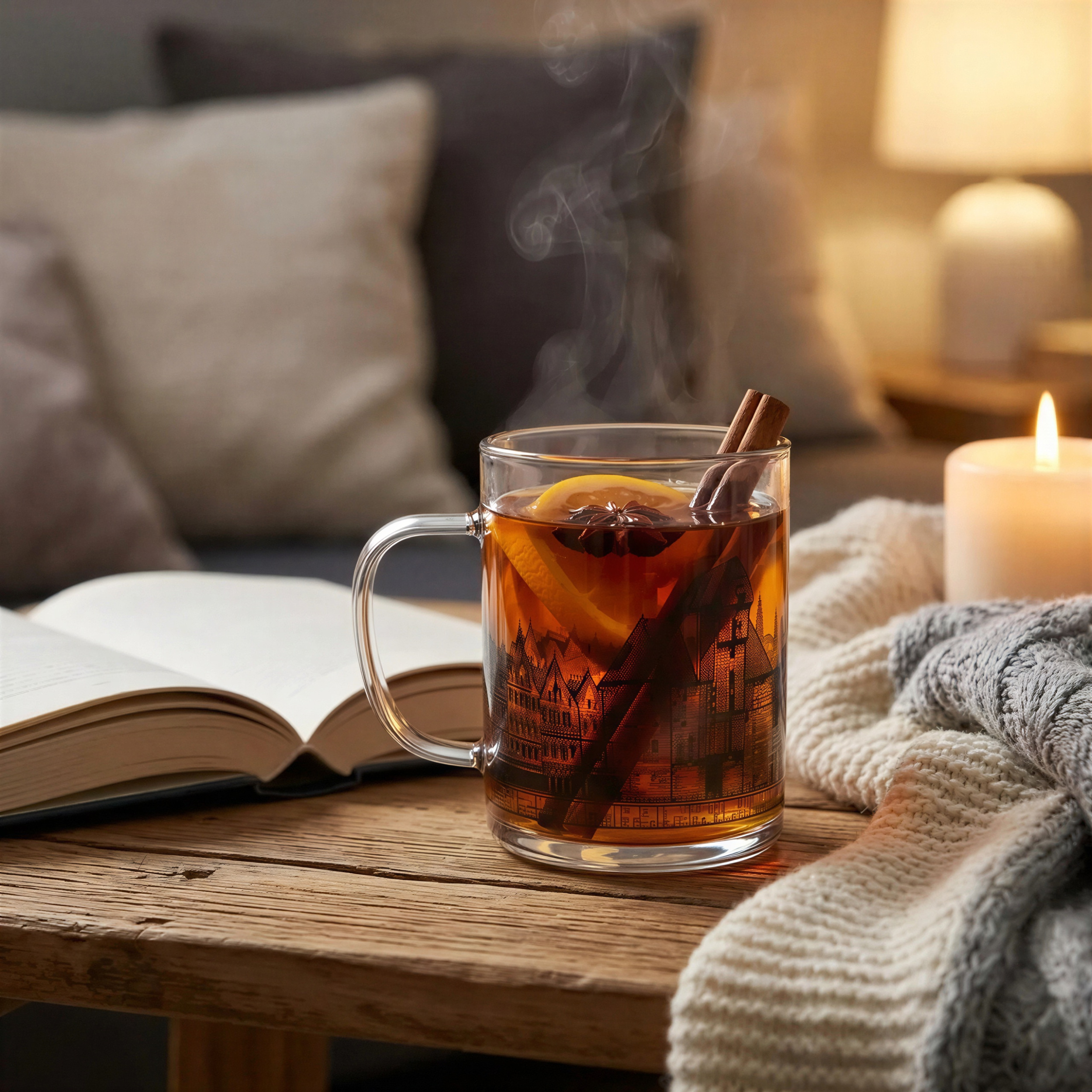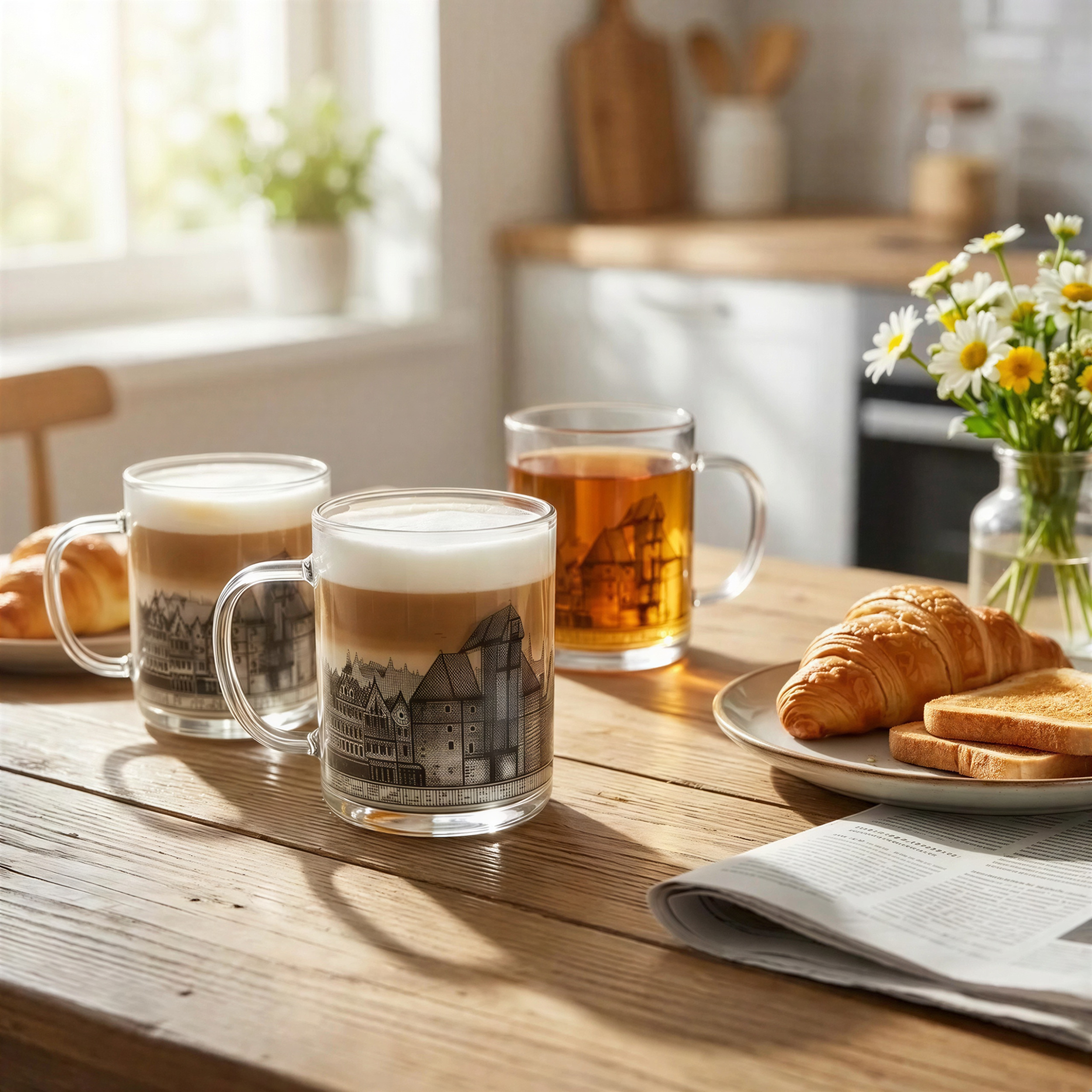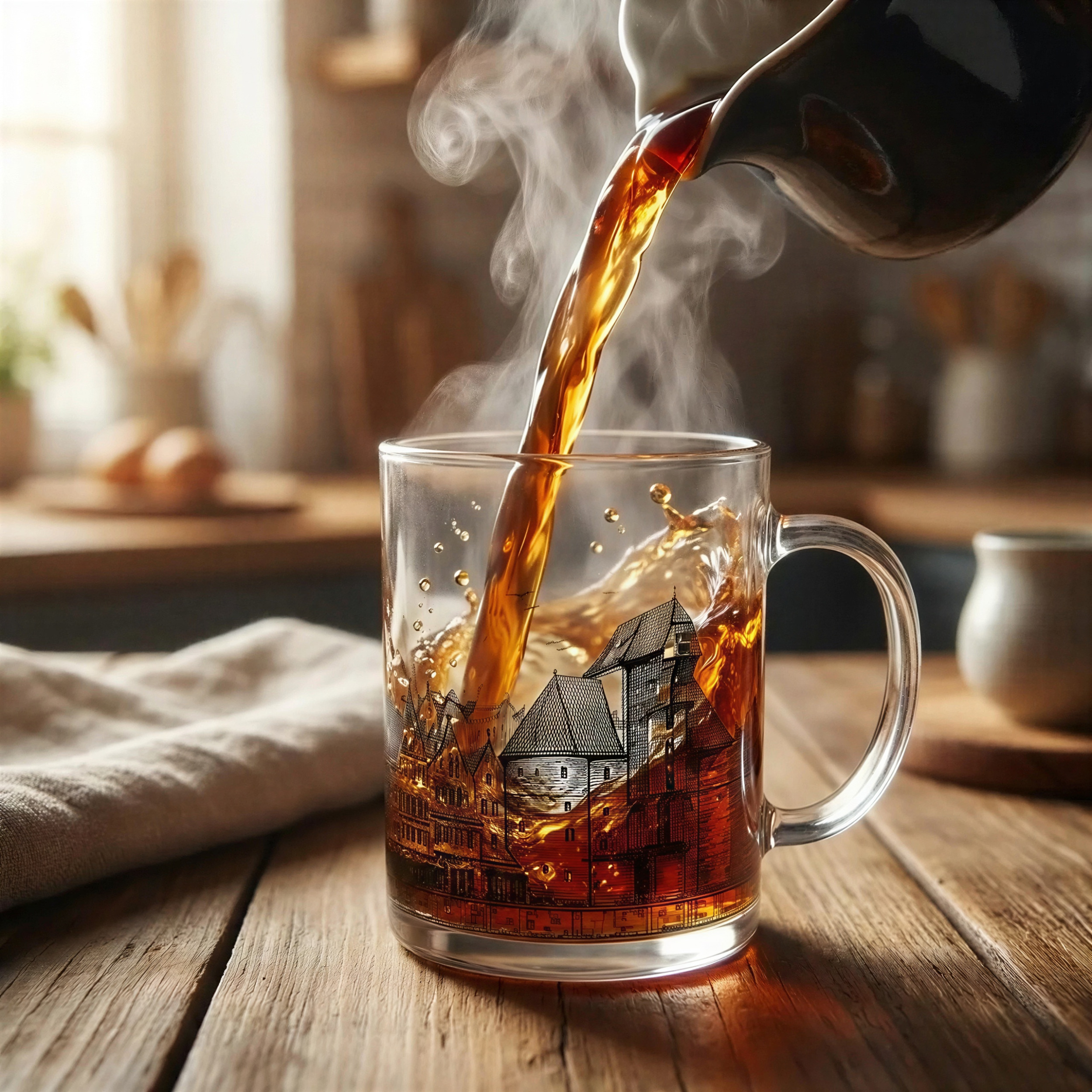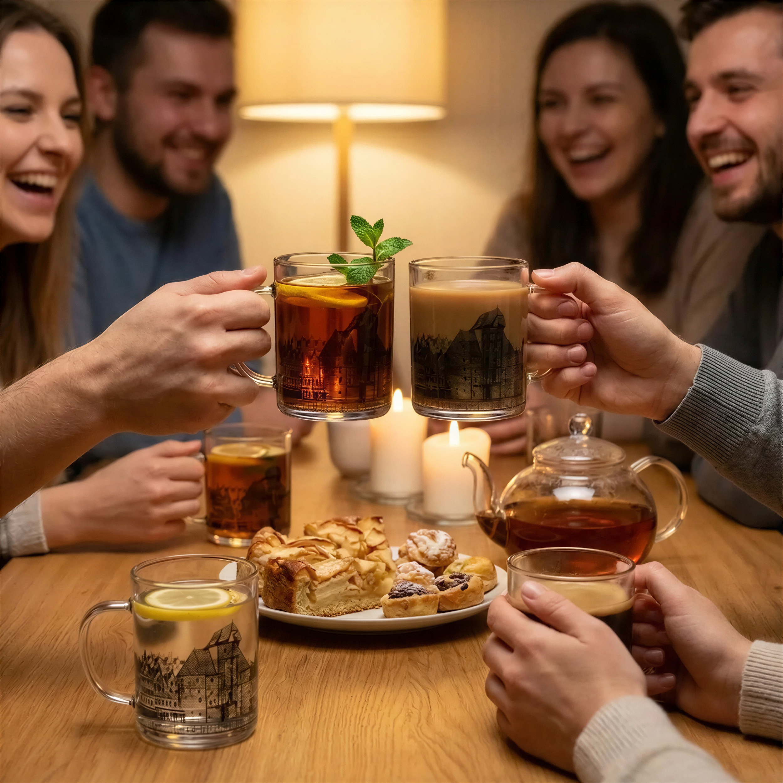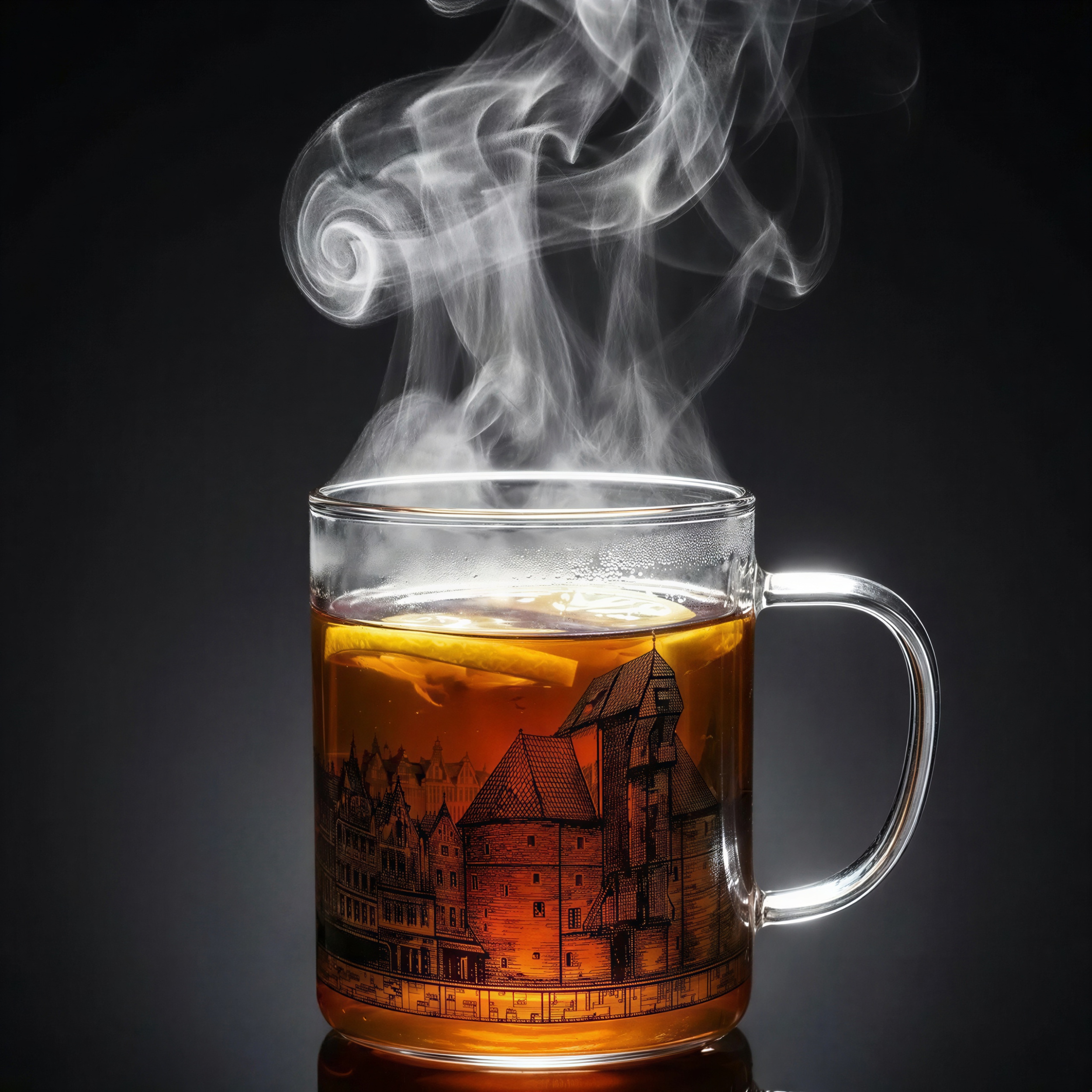 Na dotik občutite gladko, hladno steklo , ki se v roki zdi trdno, a hkrati lahko. Ob pogledu na črni potisk vidite vsako podrobnost gdanske arhitekture, ki se harmonično združuje z barvo vaše najljubše pijače. To je senzorična izkušnja, ki deluje kot mini potovanje nazaj v čas, poudarjeno s prosojnostjo in preprostostjo oblike ☕.