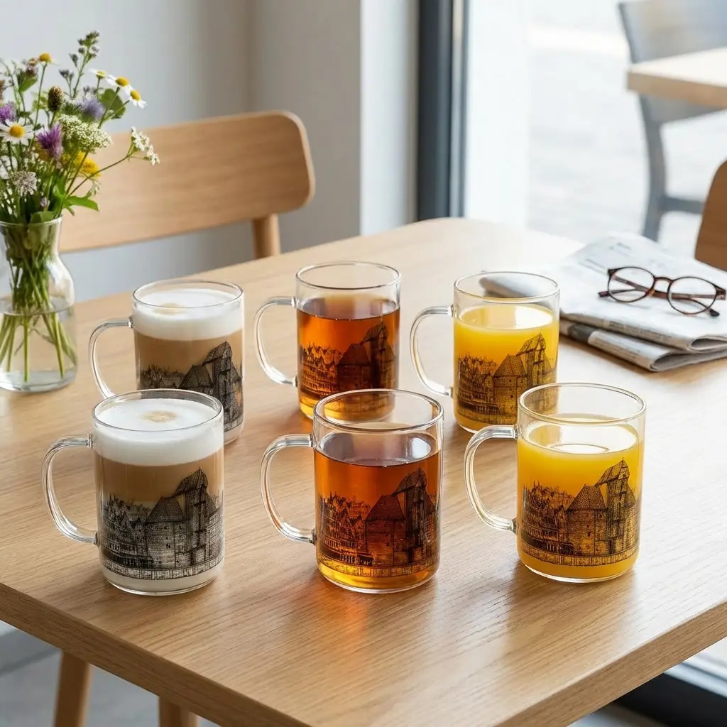 Ko sežete po kozarcu iz 6-delnega kompleta 450 ml, prozoren borosilikatni kozarec z nežnim potiskom starega mestnega jedra Gdańska začne pripovedovati svojo zgodbo. Ni le posoda za serviranje pijač; je majhen ritual, ki v vaš dan vnese kanček čarovnije in urbanega pridiha.