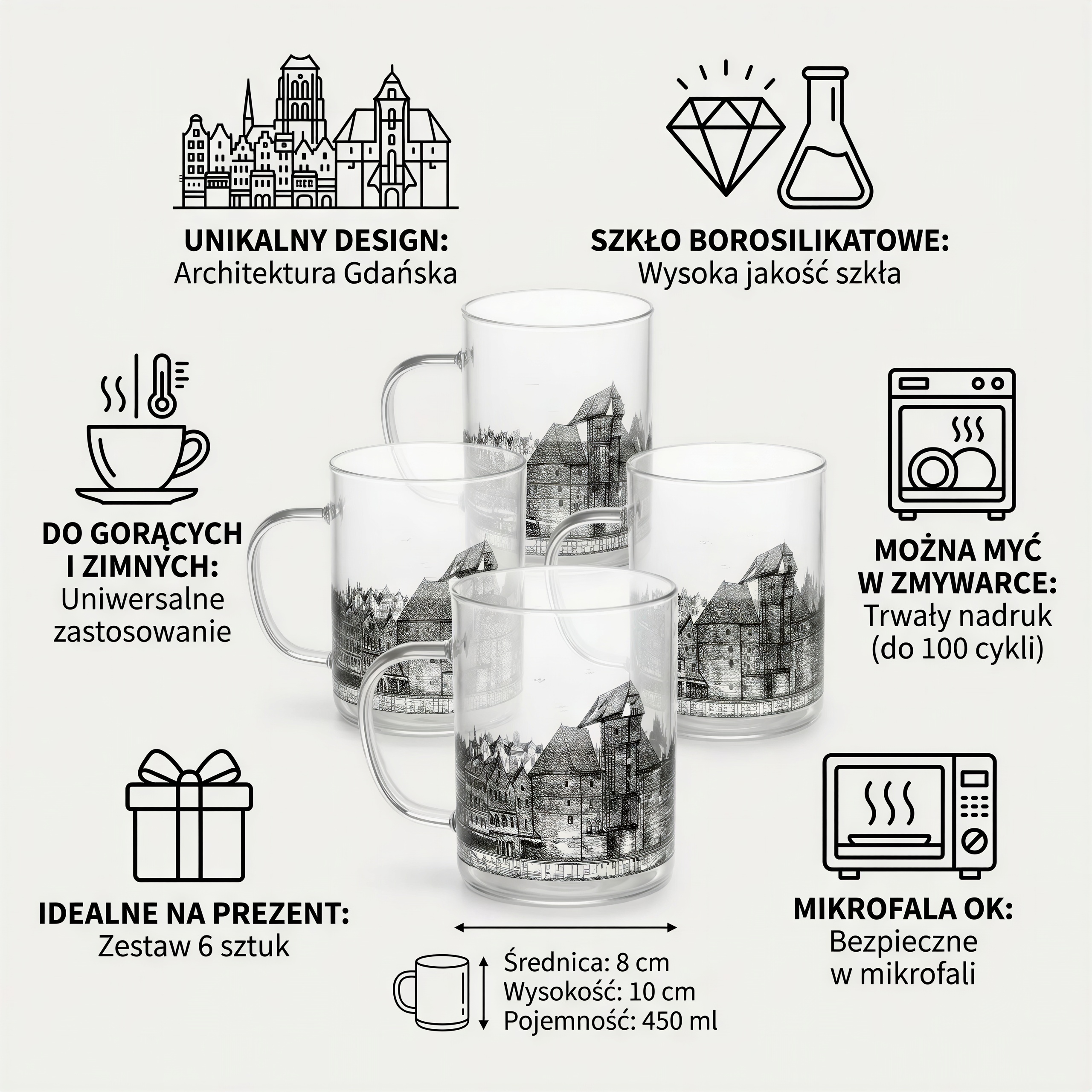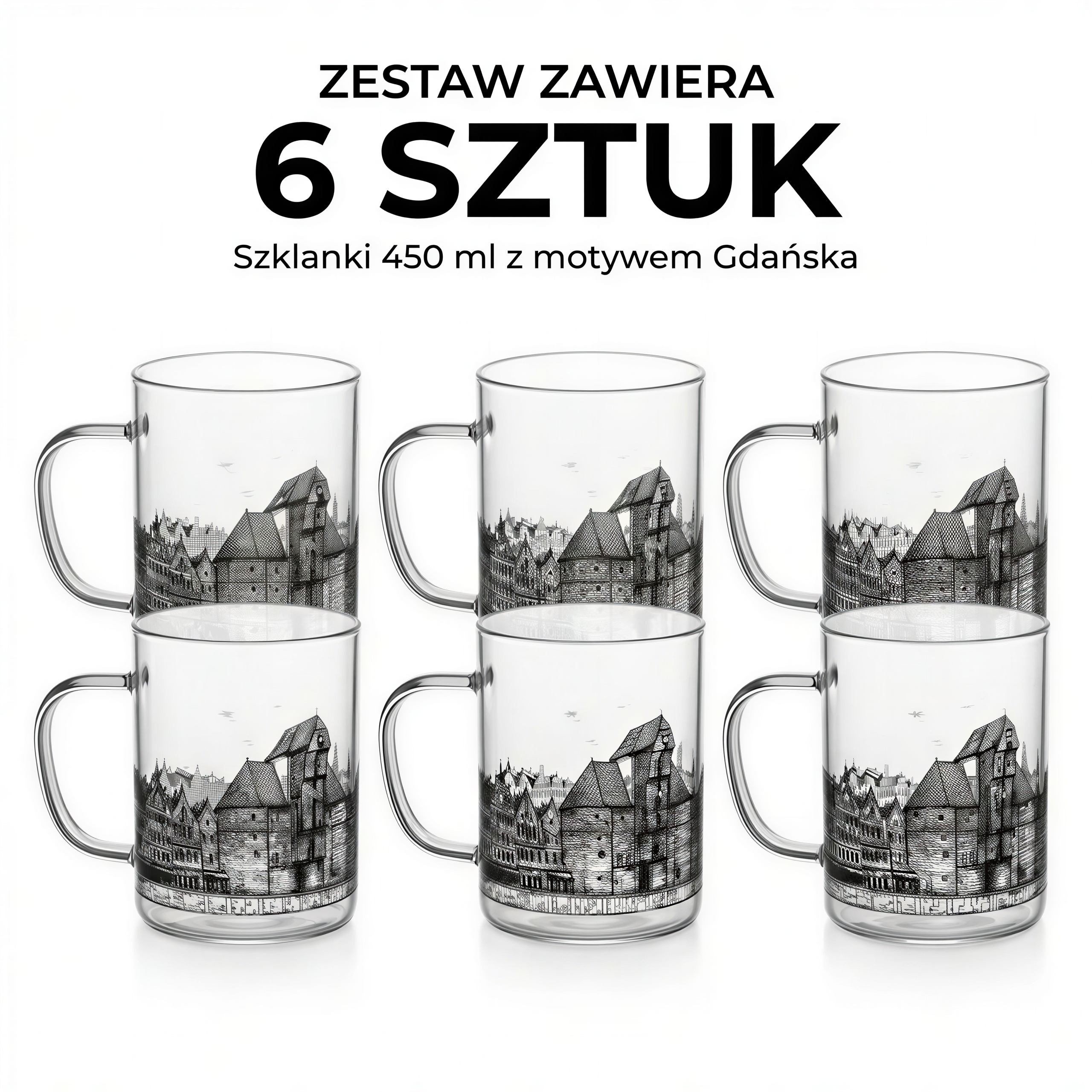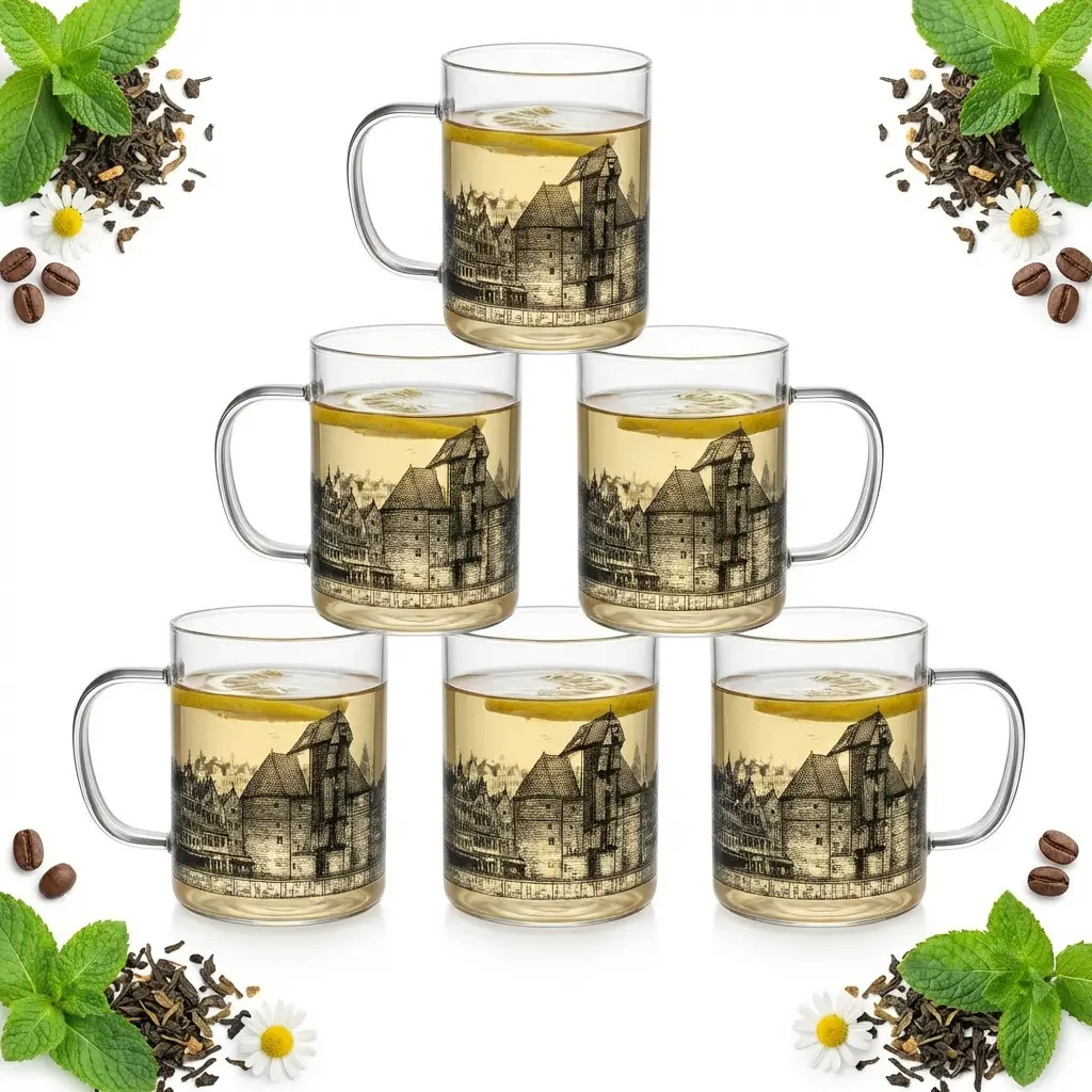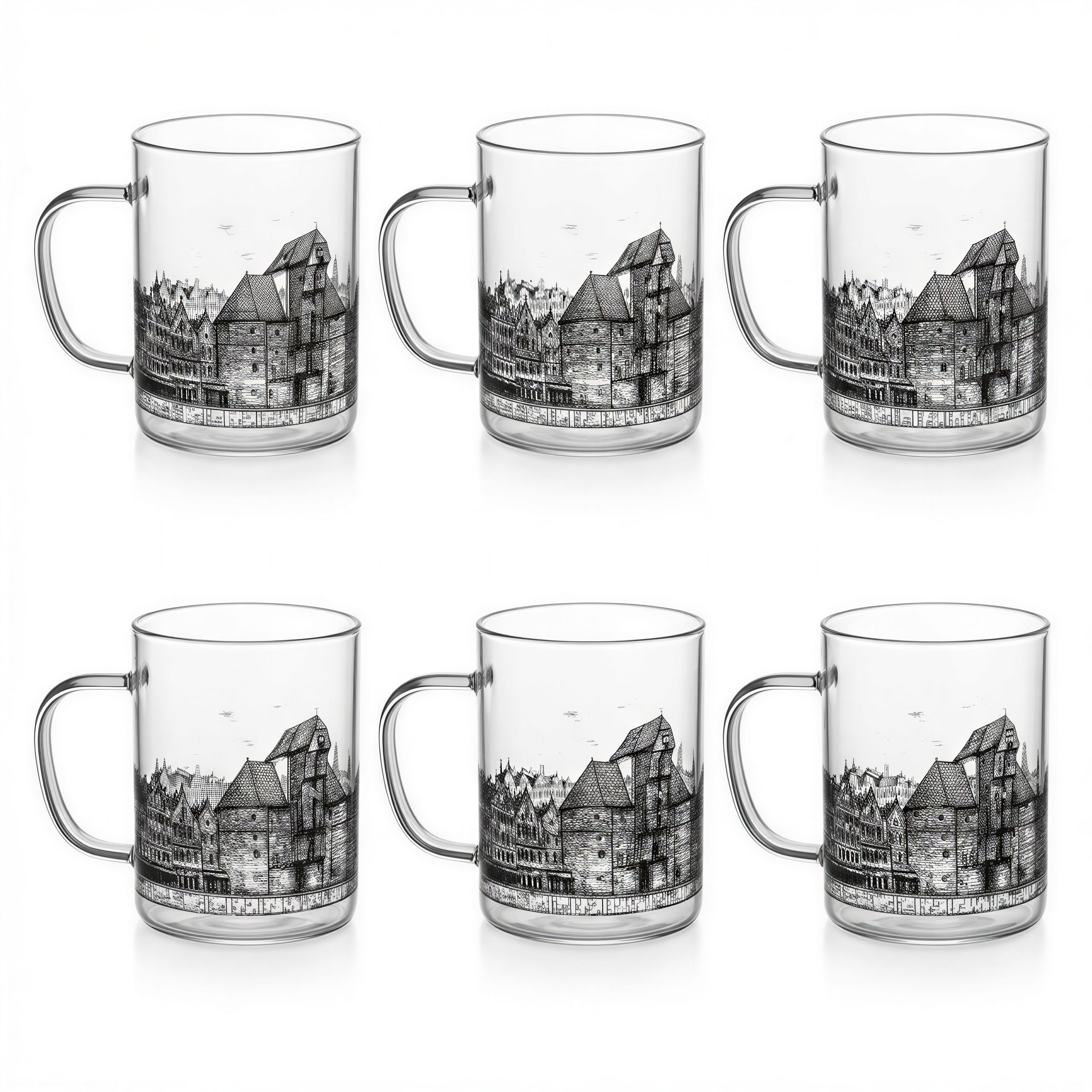 Komplet 6 kozarcev za serviranje iz trpežnega borosilikatnega stekla, idealen za vsakodnevno uporabo in kot spominek z motivom Gdanska
