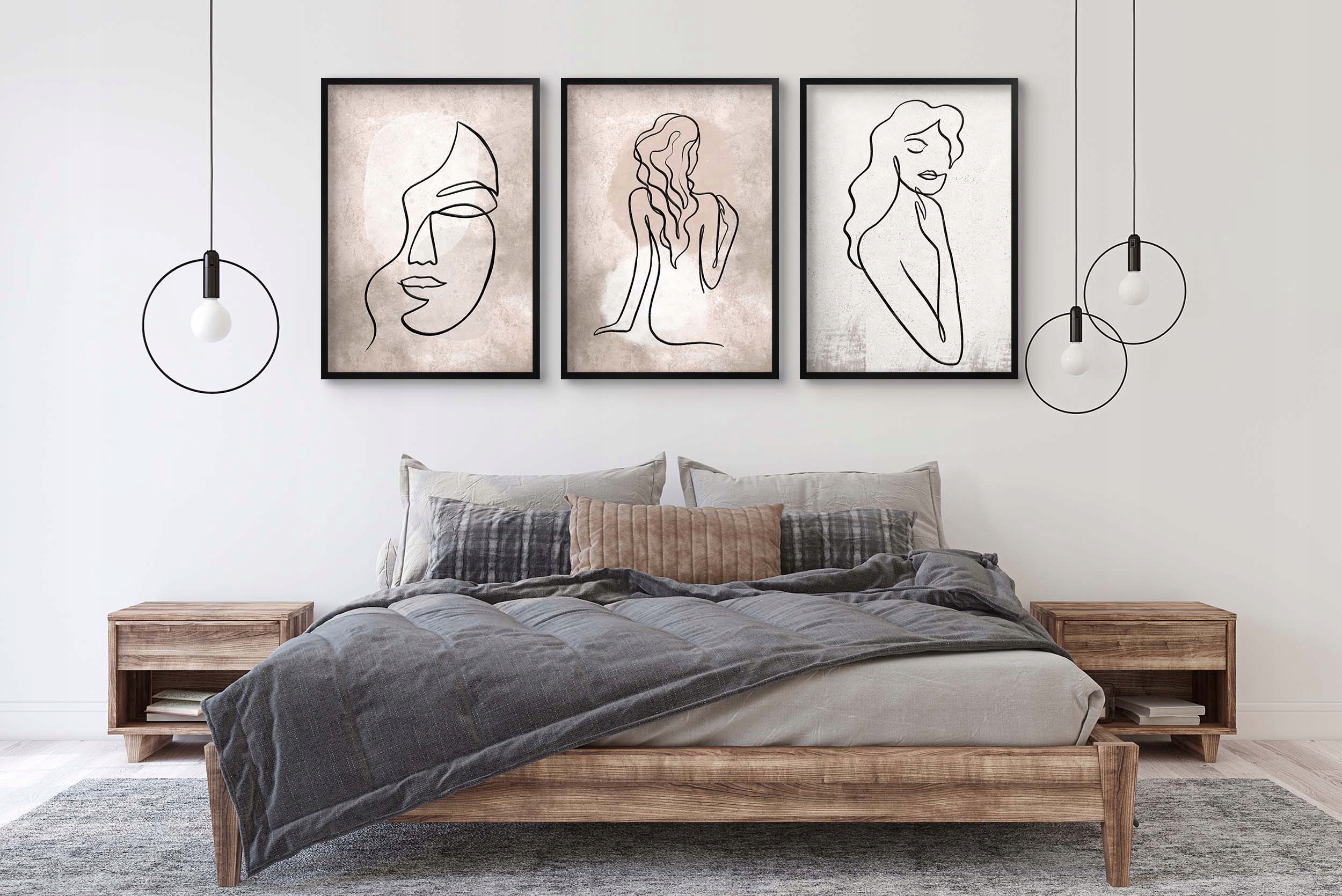 Stenski umetniški plakati v črnem okvirju – abstraktna spalnica.