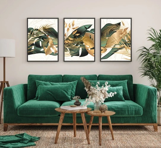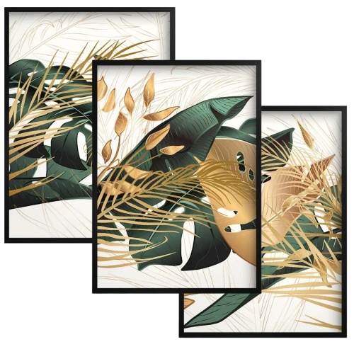 Zlati stenski plakati v črnih okvirjih za dnevno sobo ali spalnico.