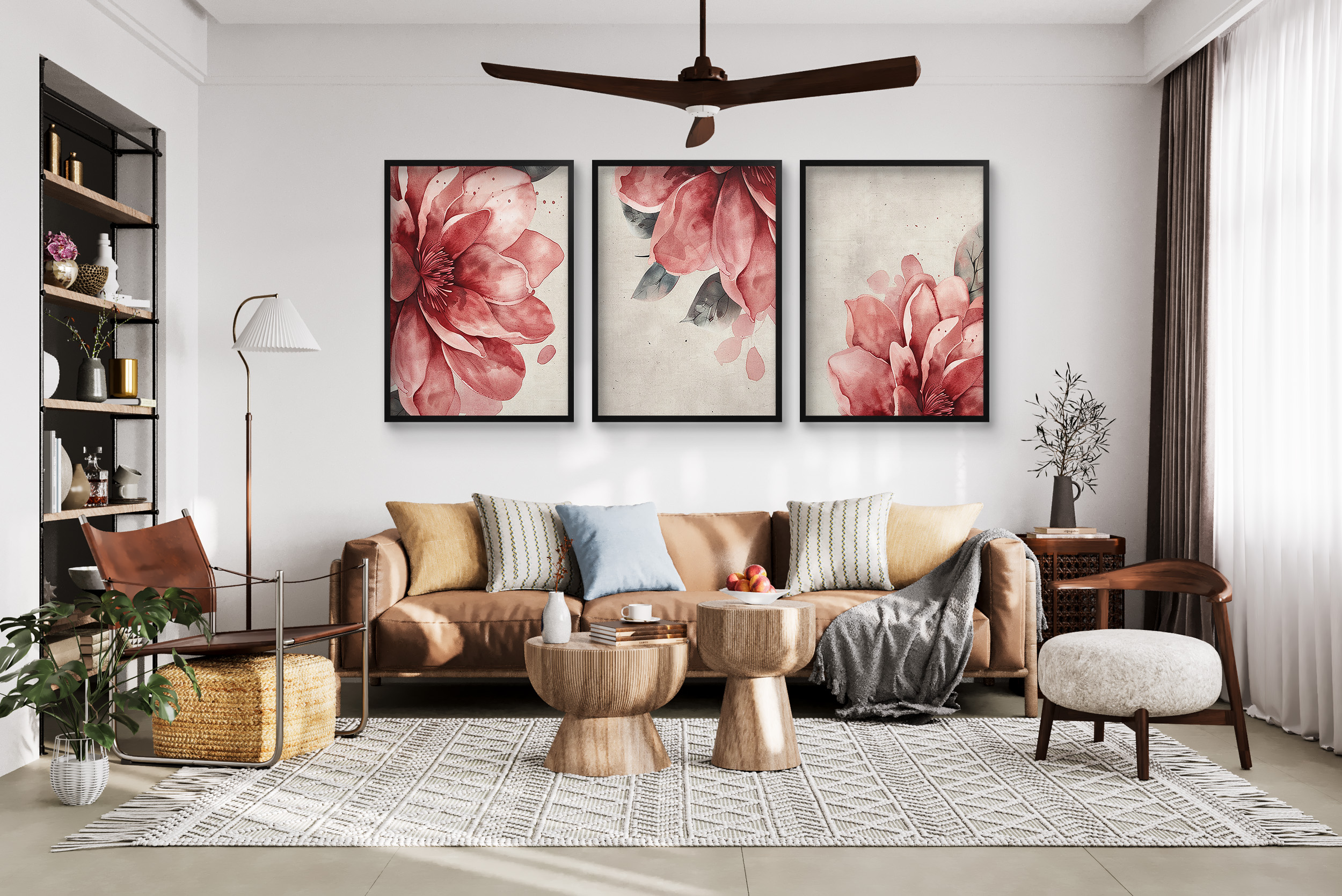 Stenske slike, plakati v črnih okvirjih, spalnica z rožnatimi cvetovi.