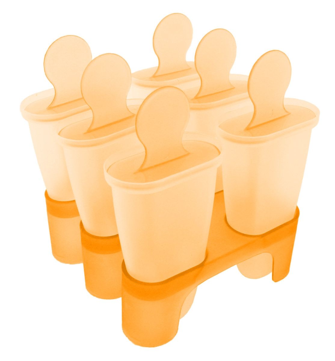 Komplet 6 kalupov za pripravo sladoleda. Vsi kalupi so opremljeni s paličicami in posebnim stojalom. Izdelani so iz trpežne in zelo odporne plastike, zato jih lahko vedno znova uporabljate. Odličen način za pripravo in shranjevanje domačega sladoleda. Priprava sladoleda je zelo preprosta – napolnite vse kalupe, vstavite vanje paličice, jih postavite na stojalo in postavite v zamrzovalnik.