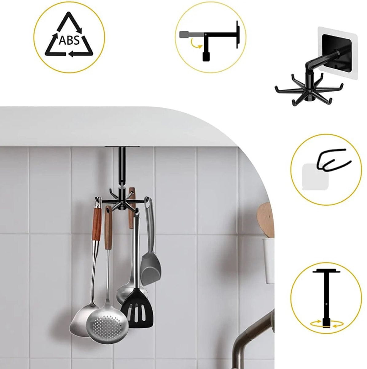 Samolepilni kuhinjski obešalnik. Opremljen je s 6 kavlji, nameščenimi na vrtljivem obešalniku. Priročna, neinvazivna namestitev s trakom. Zaradi možnosti zlaganja roke je mogoče obešalnik namestiti tako navpično (pod omarico) kot tudi na steno.