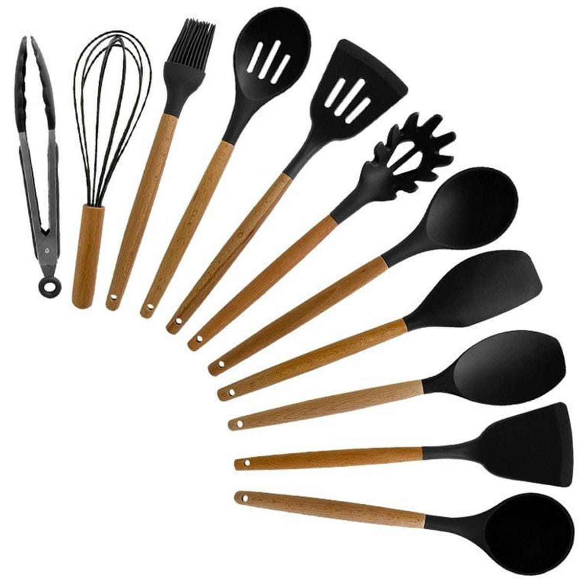 Večnamenski in popoln komplet kuhinjskih pripomočkov. Komplet vsebuje do 12 pripomočkov, ki so nepogrešljivi v vsaki kuhinji. Izdelan je iz lahke in trpežne plastike, ki ne bo opraskala površine posode (silikonske konice). Odporen na vročino in varen v stiku z živili. Komplet vključuje praktično posodo, ki deluje tudi kot odcejalnik.