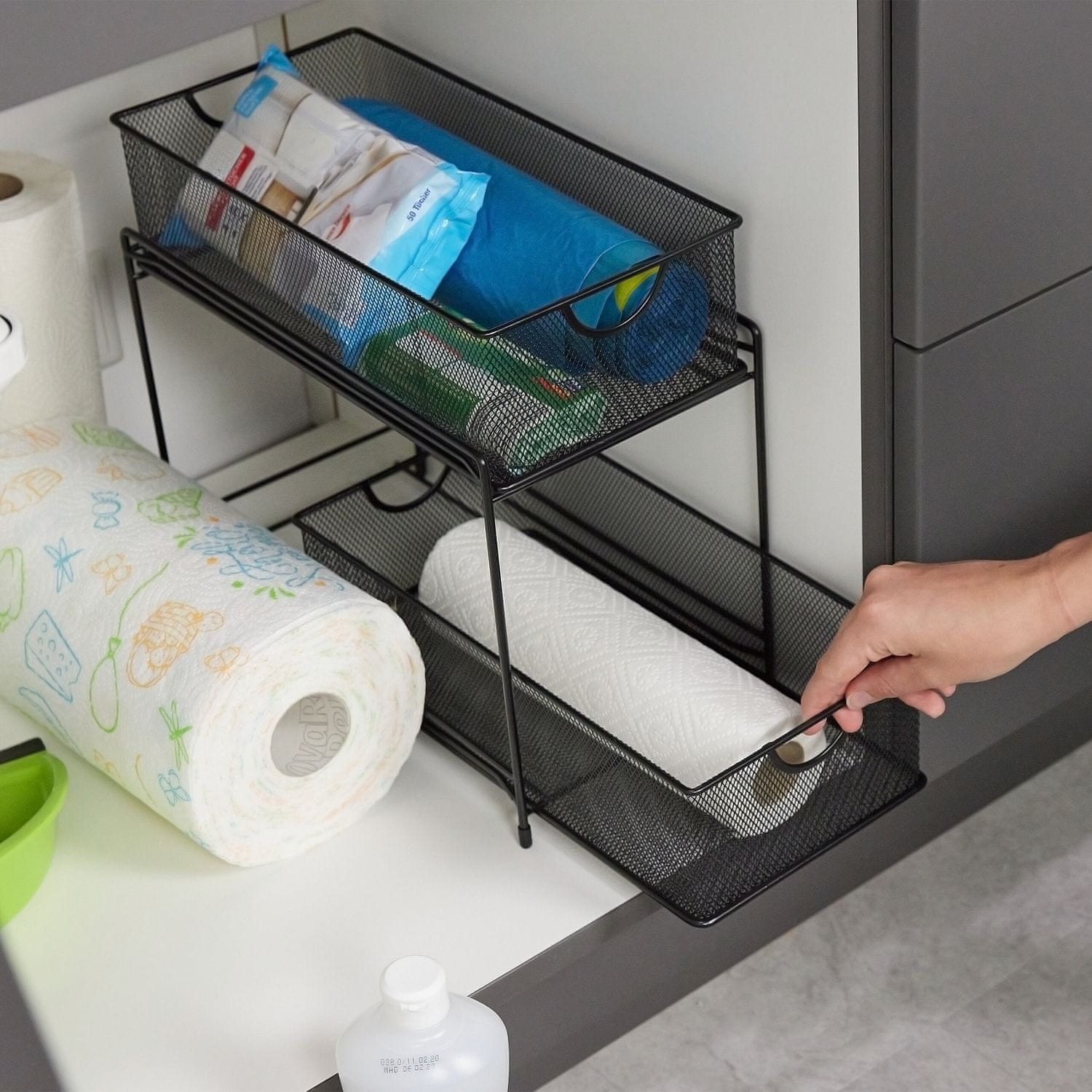 Optimizirajte svojo kuhinjsko shrambo s to pregrado za police z izvlečnimi košarami, popolno za organiziranje živil in čistilnih pripomočkov. Njegov tanek dizajn se brezhibno prilega v omarice in pod umivalnike.