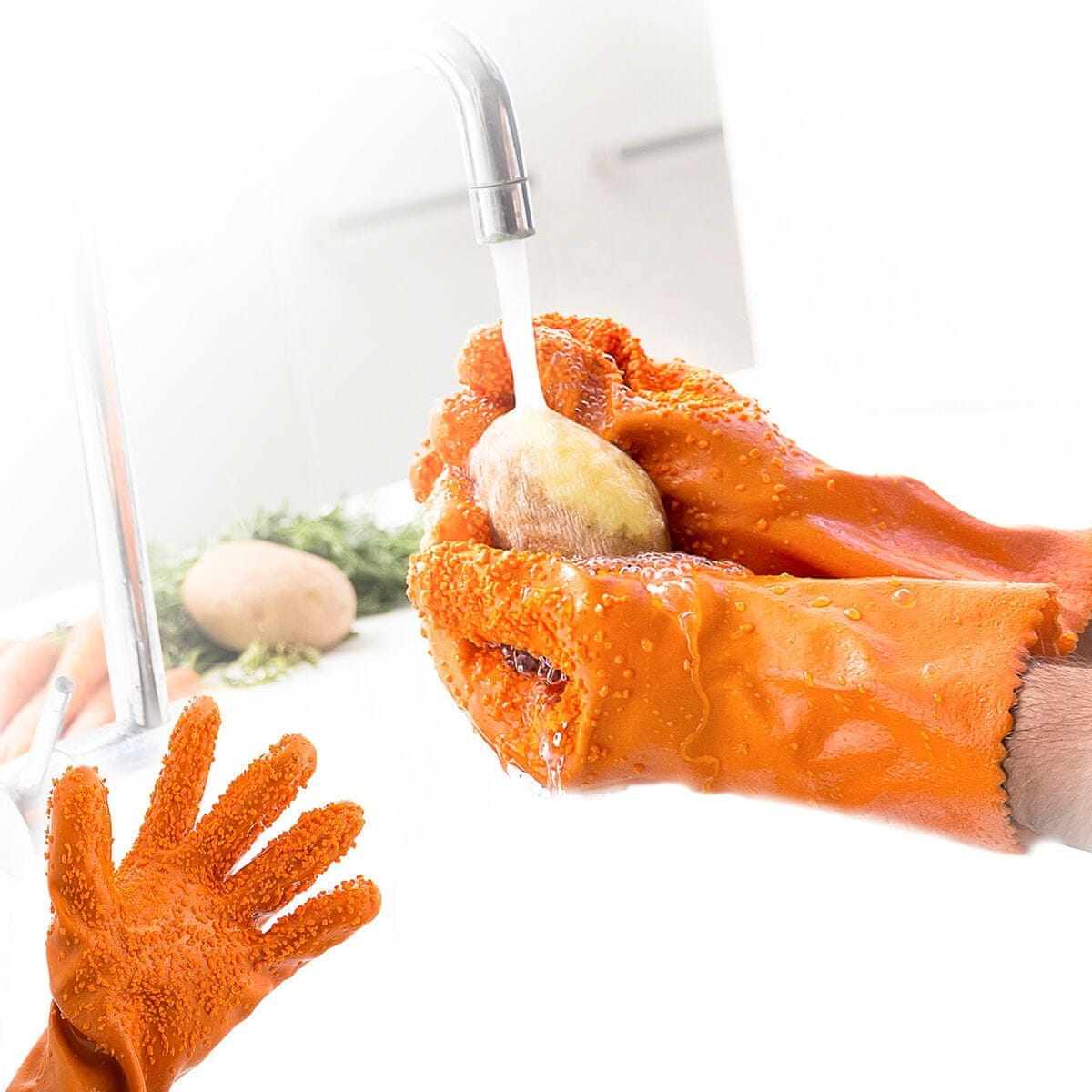 Te rokavice za čiščenje sadja in zelenjave so zelo enostavne za uporabo. Preprosto jih položite in kožo sadja ali zelenjave temeljito zdrgnite pod tekočo pipo, da jo popolnoma očistite in odstranite vse sledi umazanije ali usedlin.