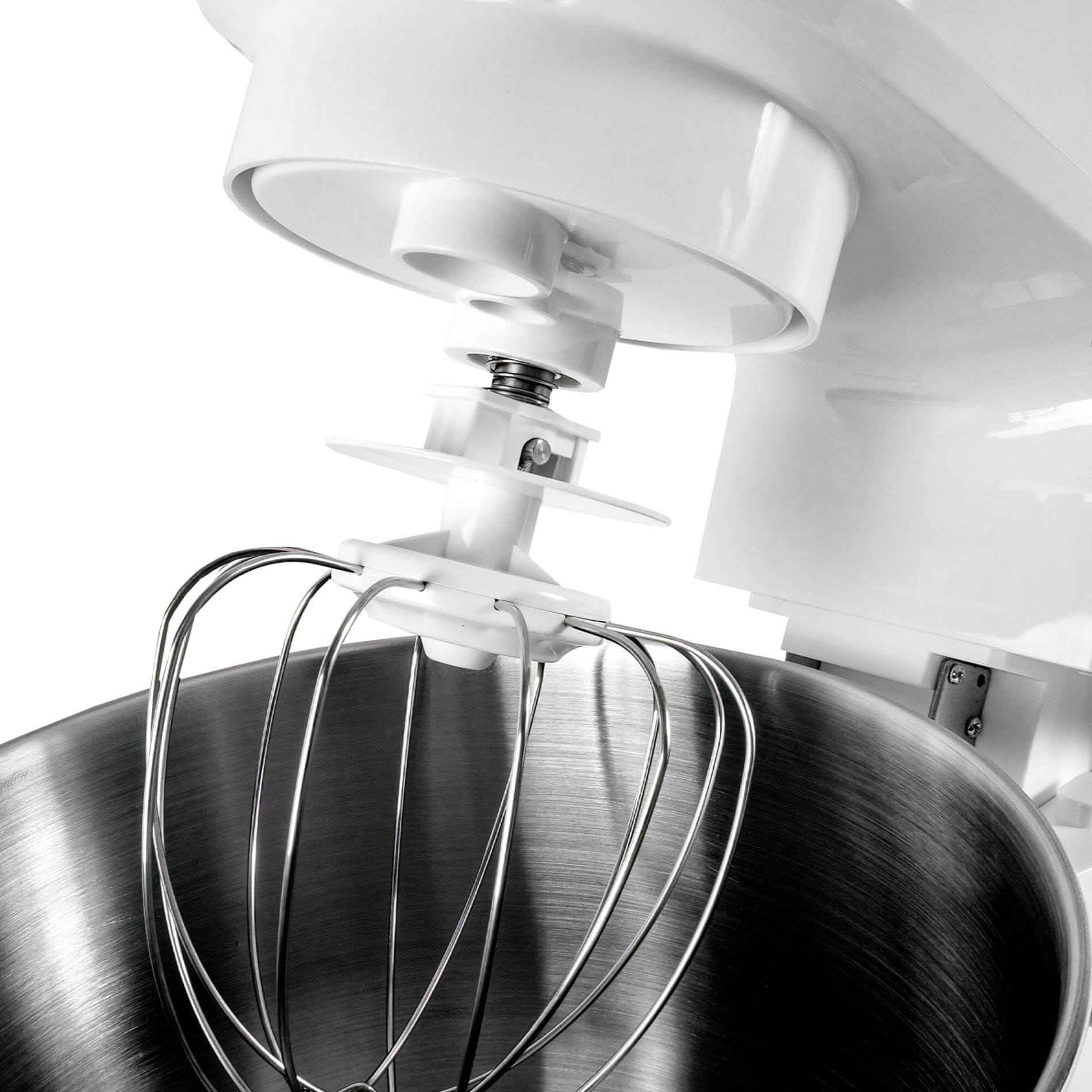 Kuhinjski robot je opremljen z nihajno roko, ki olajša dostop do posode in menjavo nastavkov. Zaradi zaščite proti brizganju z odprtino za dolivanje lahko med mešanjem dodajate sestavine, ne da bi vas skrbelo za nered. Sesalci na spodnji strani robota zagotavljajo, da bo naprava trdno stala na svojem mestu, tudi pri najvišjih hitrostih.