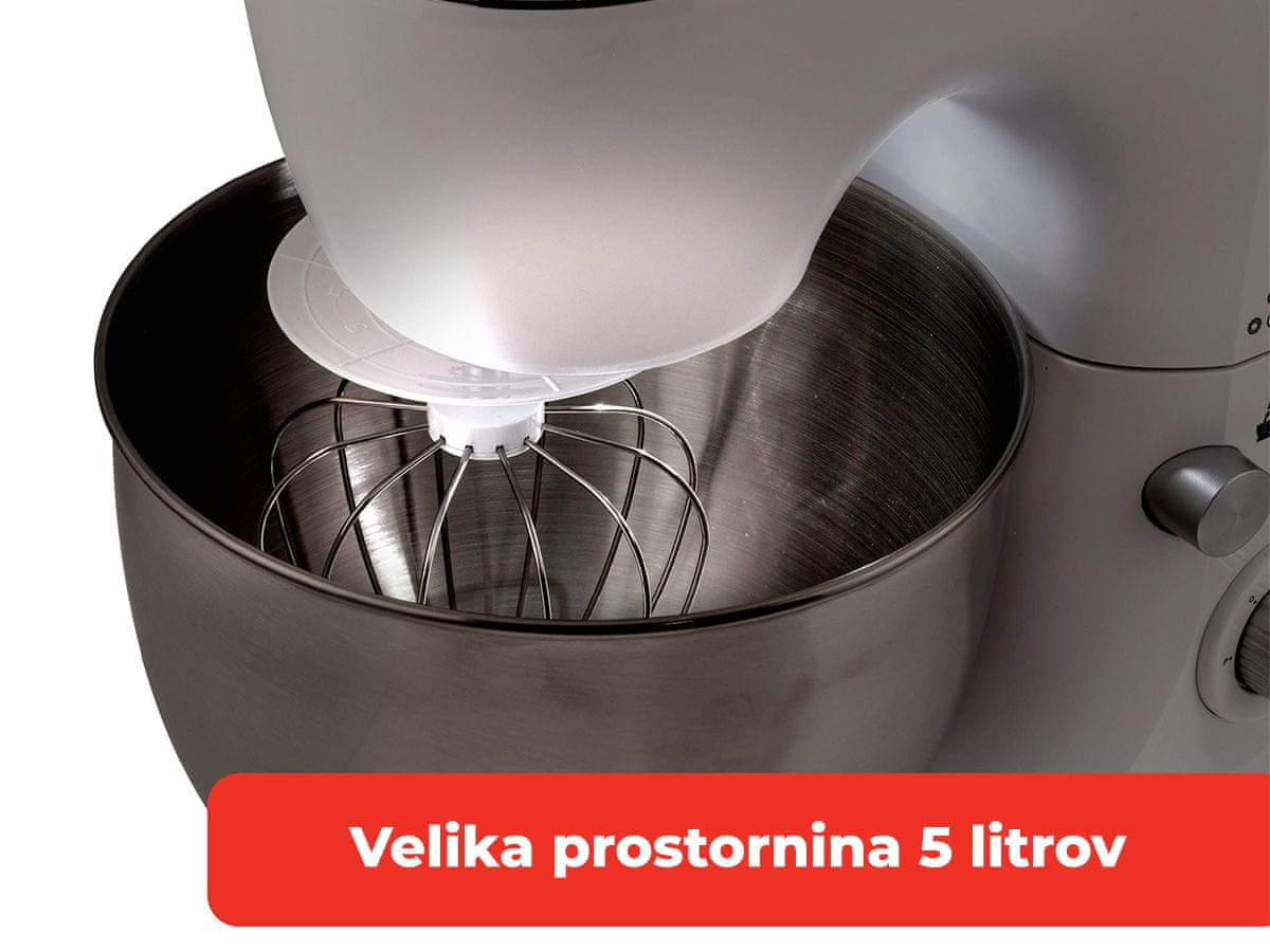 - Priloženi 3 nastavki (kavelj za testo, metlica, stepalnik) in zaščita pred škropljenjem za posodo.