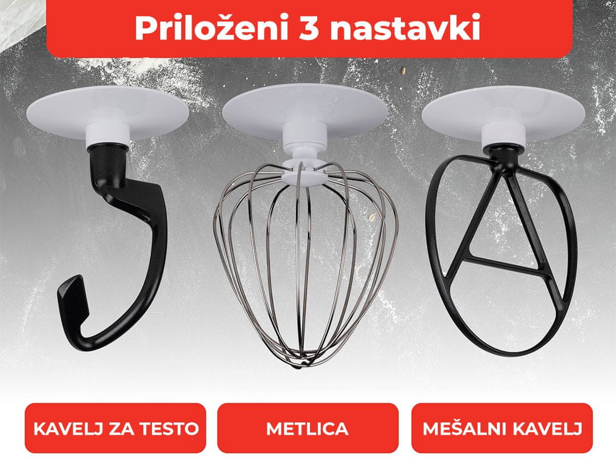 | Nastavki | da (kavelj za mešanje testa, metlica za stepanje, kavelj za mešanje tekočin) |