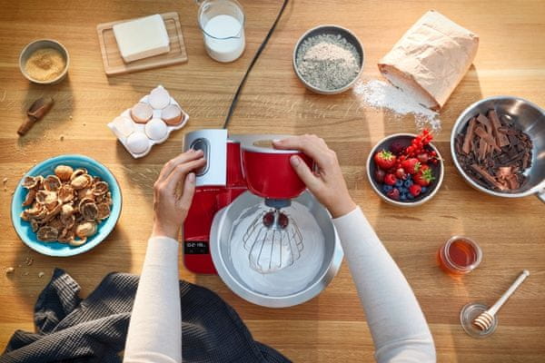 Funkcija EasyArm Lift vam omogoča, da z mešalno roko enostavno upravljate že s pritiskom gumba, pripomočke za mešanje pa ustavite na zadnji strani posode, tako da lahko sestavine preprosto dodajate s sprednje strani.