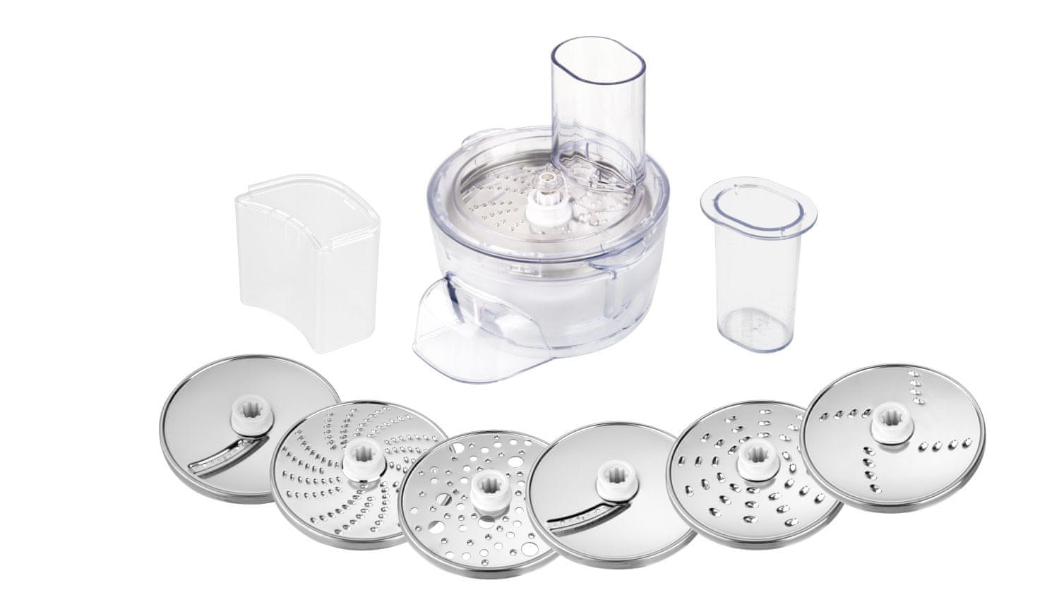 Inovativni nastavek za stepanje z razširjenim delom zagotavlja učinkovitejše mešanje sestavin na stenah posode. Poleg robota boste med drugim prejeli posodo iz nerjavečega jekla s prostornino 6,7 l, vključno s prozornim pokrovom za do 2,5 kg testa, kavljem za gnetenje, metlico, metlico za mešanje, fleksi metlico za kreme in lahka testa, mešalnik za led, tlačilec, nastavek za ribanje, mlin za meso in večnamenski sekljalnik hrane. Z brezstopenjskim nadzorom hitrosti lahko enostavno izberete hitrost in intenzivnost predelave surovin.